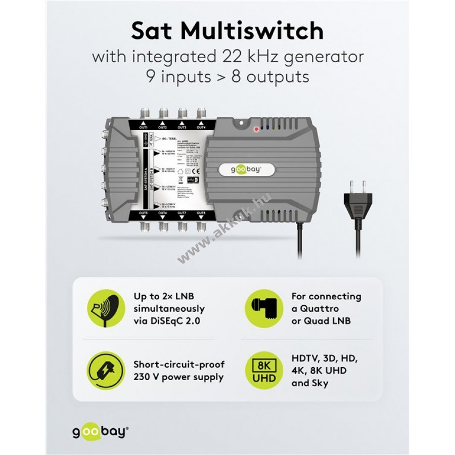 Beépített 22 kHz-es jelgenerátorral rendelkezik és Quattro illetve Quad LNB-khez egyaránt alkalmas.