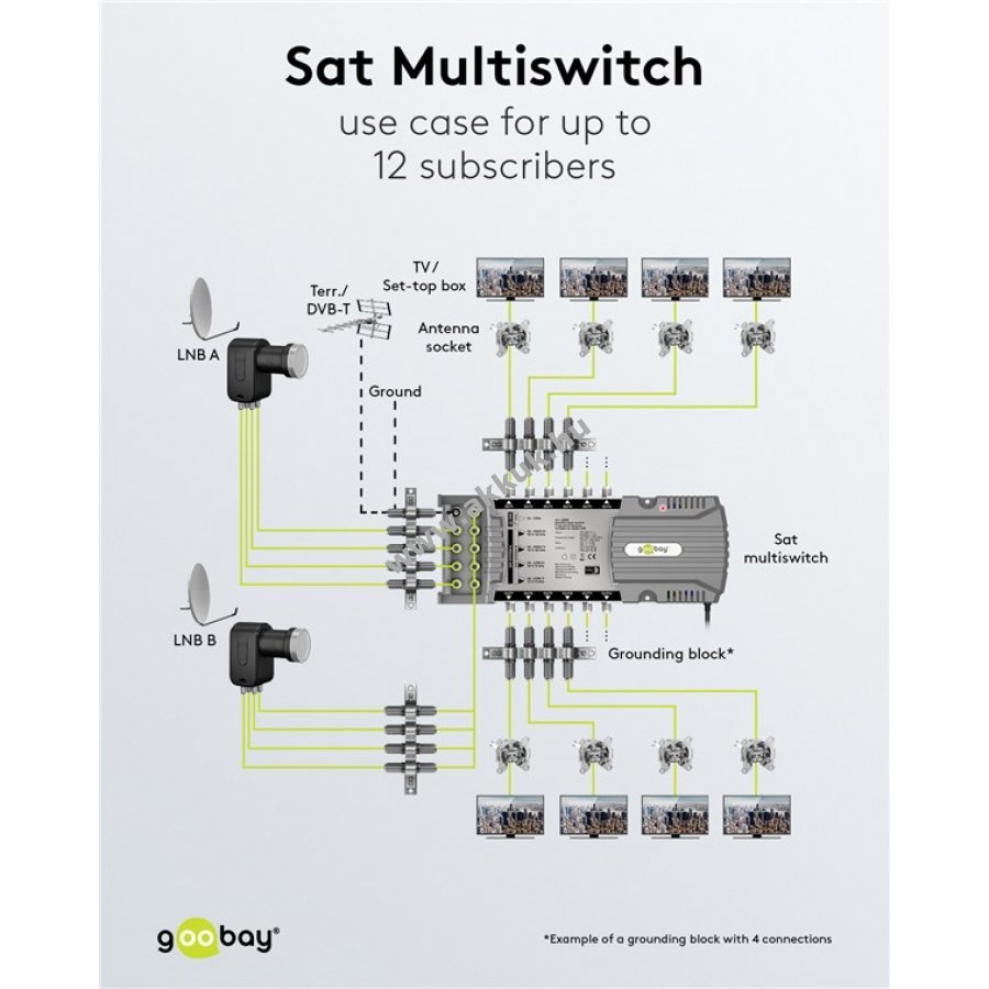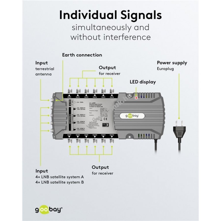A multiswitch kényelmes megoldás több TV és rádió vevő egyidejű csatlakoztatására egy műholdvevő antennához ugyanabban az épületben. Minden 12 felhasználó egyedi műsorokat élvezhet a maximális rugalmasság érdekében.