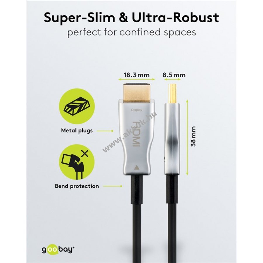 Az optikai hibrid High-Speed HDMI kábel akár 100 m távolság áthidalására alkalmas nagyobb rugalmasságot és gyorsabb adatátvitelt biztosít mint a hagyományos rézkábelek. 4K UHD felbontás támogatása 60 Hz-en és 18 Gbit/s maximális adatátviteli sebesség jellemzi. Kompatibilis ARC, HDCP, 3D és EDID funkciókkal. A kábel aktív optikai technológiával (AOC) készült, hibrid üvegszál-rez vezetővel a zavarmentes jelátvitel érdekében. Az üvegszálas rész elektromos jeleket optikai jelekké alakítja át és a kábel végén vissza elektromos jellé (egysávos irány). A vékony, strapabíró fém csatlakozók hajlításvédelemmel rendelkeznek, így szűk helyeken is jól használhatók. Ideális TV-k, monitorok, játékkonzolok (PlayStation, Xbox), projektorok és streaming eszközök (Amazon Fire TV, Apple TV) összekötésére. Az üvegszálas anyag nagyfokú hajlékonyságot és kis hajlítási sugarat tesz lehetővé.
