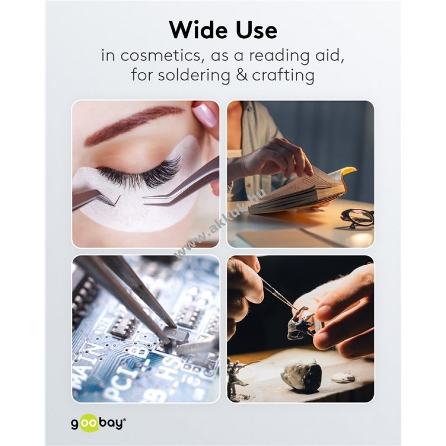 Tartós nappali fehér SMD LED-ek biztosítanak színhelyes megvilágítást. 100 mm átmérőjű üveglencse 3 dioptriával és 1,75-szeres nagyítással. A lencse gyorskioldóval szerszám nélkül cserélhető. Rugalmas nyak lehetővé teszi a lámpa egyéni beállítását. Sokoldalúan használható kozmetikában, olvasáshoz vagy precíziós munkákhoz, például forrasztáshoz és barkácsoláshoz. Kiváló asztali nagyítóként, íróasztali vagy rajzoló lámpaként. Puha párnázatú bilincs felületkímélő és stabil rögzítést biztosít.