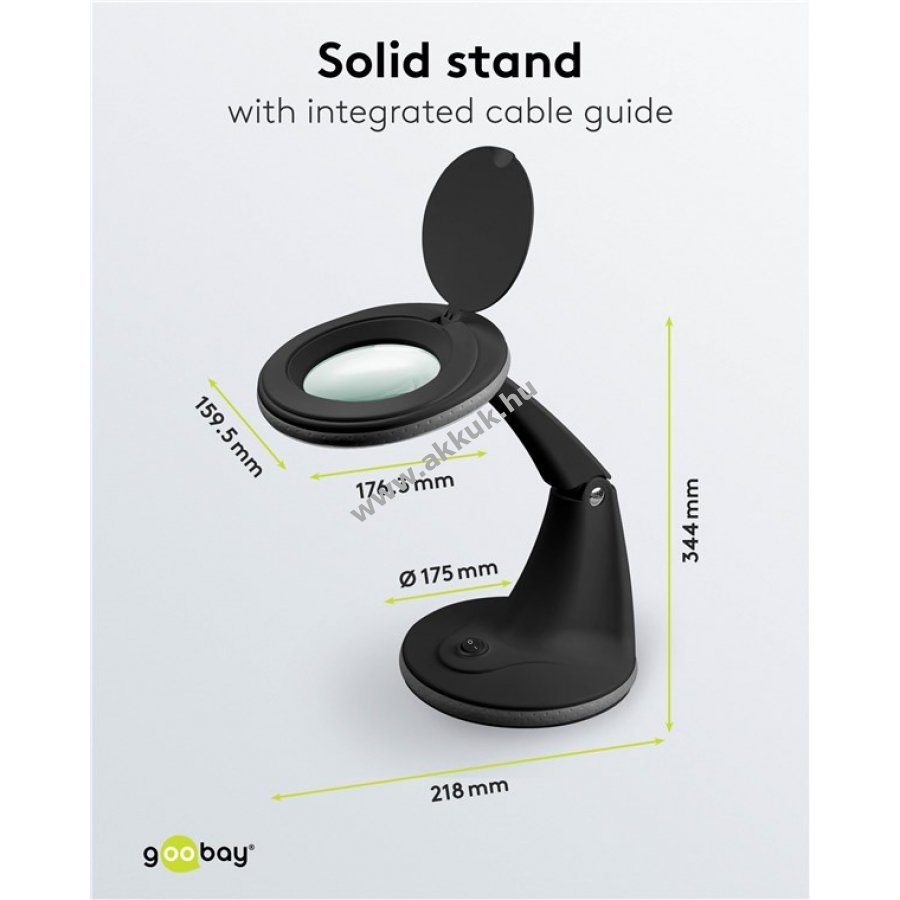 Állványos nagyító lámpa 100 mm átmérőjű üveglencsével és árnyékmentes nappali fehér LED gyűrűvilágítással. 3 dioptriás és 1,75-szörös nagyítású standard üveglencse nem cserélhető. A flexibilis, 330 mm-es munkatartományú konzol beépített kábelvezetővel rendelkezik. A nagyítófej akár 90°-ban dönthető. Csúszásmentes asztali talp stabil tartást biztosít. Univerzálisan használható kozmetikában, olvasáshoz vagy precíziós munkákhoz, például forrasztáshoz és kézműves tevékenységekhez. Új generációs SMD LED-ekkel jobb megvilágítást és szórt fényt biztosít a tökéletes világítás érdekében.