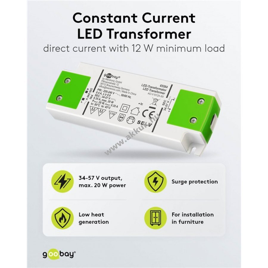 A tápegység állandó árammal látja el az LED-eket így hatékonyan megelőzi a villogást és a hő miatti károsodást. A konstansáramú meghajtó biztosítja az egyenletes fényminőséget és fényerőt még soros kapcsolás esetén is.