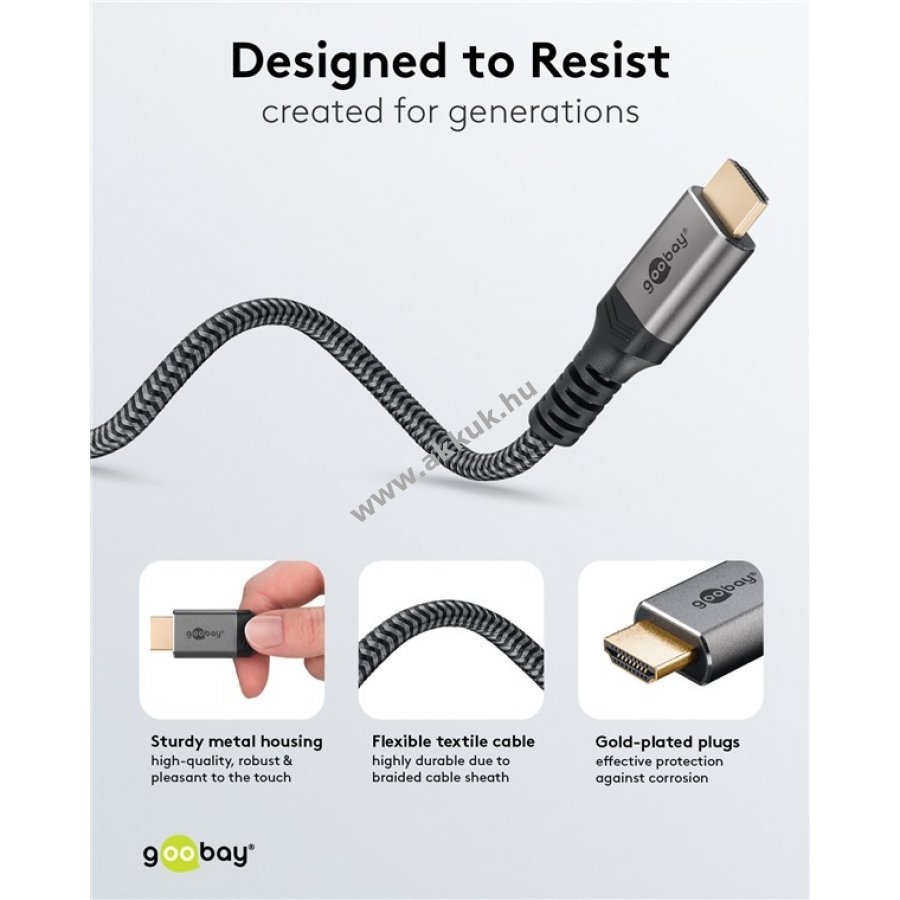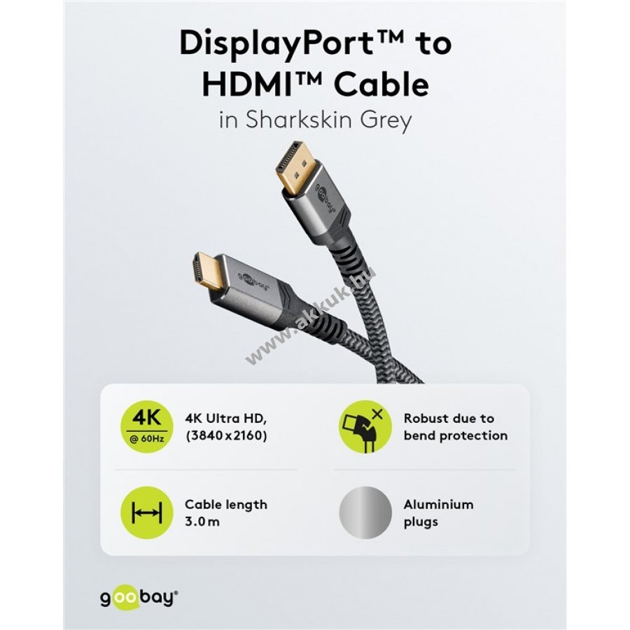 A Goobay Plus sorozat vékony fém dizájnban Sharkskin szürke színben. Kényelmes megoldás DisplayPort forrás csatlakoztatására HDMI csatlakozós TV vagy monitorhoz éles 4K kép és kiváló hangzás érdekében olyan eszközökön, amelyek nem rendelkeznek DisplayPort csatlakozóval. Passzív DisplayPort-HDMI kábel audio és videó átvitelére laptopról, PC-ről vagy grafikus kártyáról HDMI-s TV-re, monitorra vagy projektorra. A kábel DisplayPort 1.2 és HDMI 2.0 szabványokkal akár 4K 50/60 Hz Ultra HD felbontást és 18 Gbit/s adatátviteli sebességet támogat. A kábel egyirányú, kizárólag DisplayPort forrásról HDMI célra használható. Rugalmas prémium kábel vékony fém csatlakozókkal, törésvédelemmel és színben illeszkedő textilkábellel. A fonott textilborítás kellemes tapintású és kíméli a felületeket. Aranyozott csatlakozók korrózióállóak és tartósak.