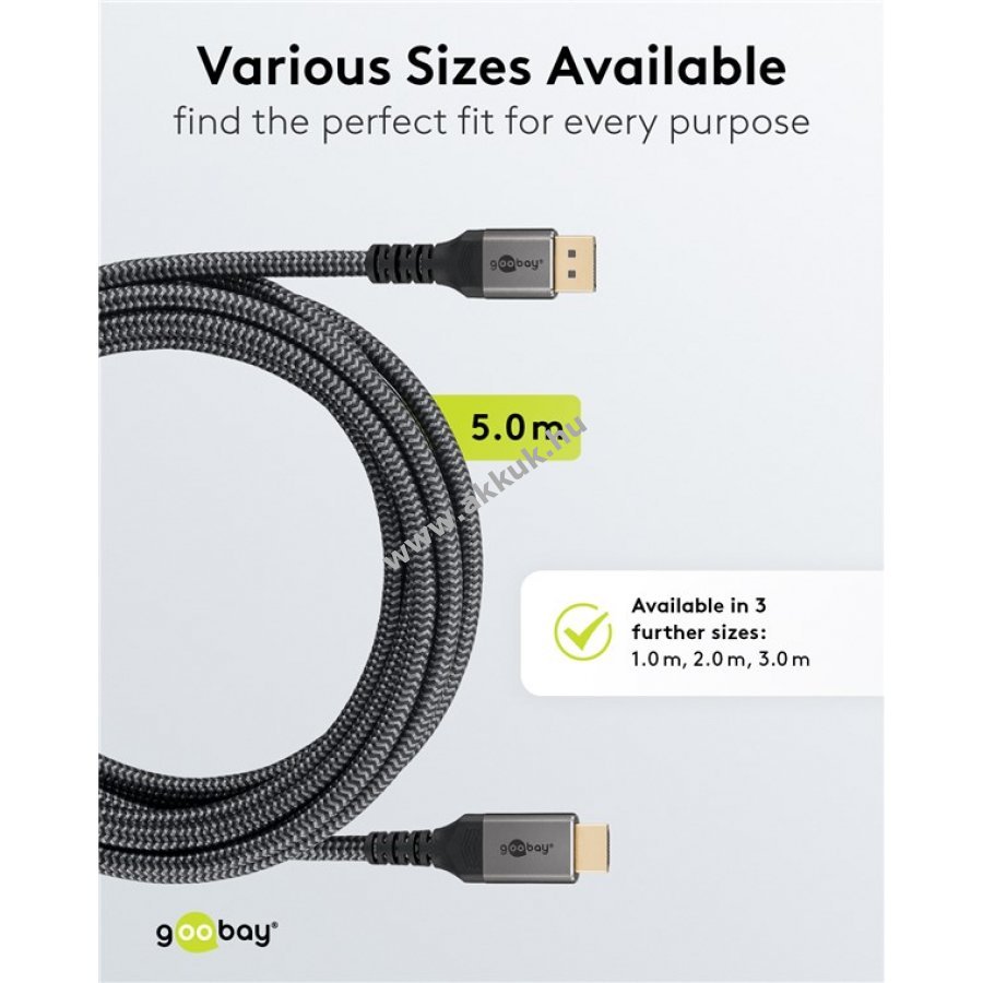 A Goobay Plus sorozat vékony fém kivitelben Sharkskin szürke színben. Kényelmes megoldás DisplayPort forrás HDMI csatlakozós TV vagy monitor összekapcsolására akár 4K felbontás és kiváló hangélmény érdekében olyan eszközöknél, amelyek nem rendelkeznek saját DisplayPort csatlakozóval. Passzív kábel hang- és képátvitelre laptopról PC-ről vagy grafikus kártyáról DisplayPort csatlakozón keresztül HDMI-s televízióhoz monitorhoz vagy projektorhoz. A kábel DisplayPort 1.2 és HDMI 2.0 szabványokat támogatva Ultra HD felbontást biztosít akár 4K 60Hz-ig és maximális adatátviteli sebesség 18 Gbit/s. A kábel egyirányú csak DisplayPort forrásról HDMI célra használható. Rugalmas prémium kábel vékony fém csatlakozókkal hajlításvédővel és színben harmonizáló textilkábellel. A fonott textilköpeny kellemes tapintású és kíméletes a felületekhez. Az aranyozott csatlakozók korrózióállóak és hosszú élettartamúak.