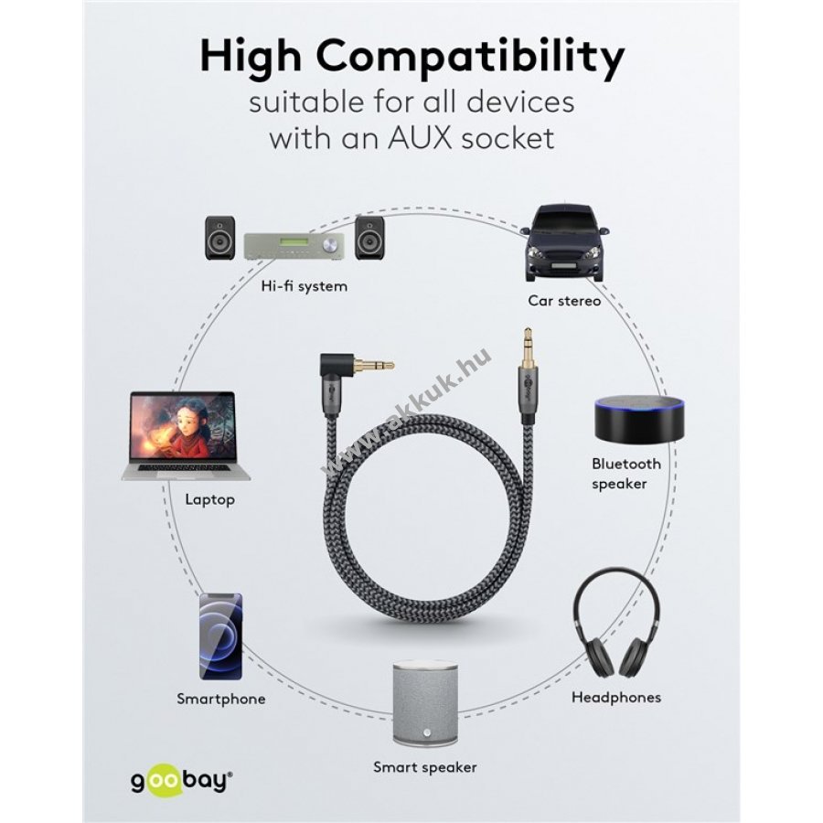 A Goobay Plus sorozat vékony fém kivitelben Sharkskin Grey színben. Az AUX kábel univerzális megoldás hang átvitelére okostelefonokról, laptopokról vagy táblagépekről. Kényelmes zene, podcast vagy filmhallgatás otthoni HiFi rendszeren vagy autórádión.