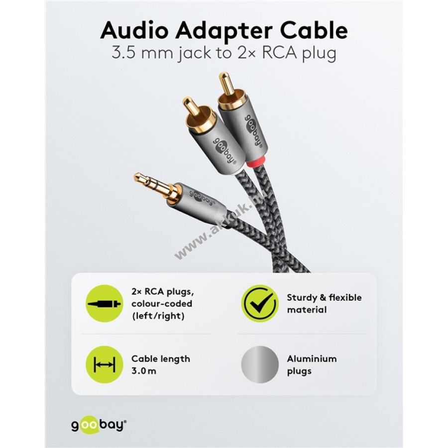 A Goobay Plus sorozat vékony fém kivitelben Sharkskin szürke színben. A cinchkábel egyszerű megoldás kristálytiszta hang átvitelére okostelefonról laptopra vagy házimozirendszerre kényelmes film- és zenehallgatáshoz kiváló minőségben.