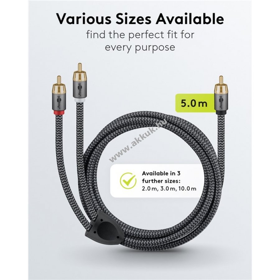 A Goobay Plus sorozat elegáns fém kivitelben Sharkskin szürke színben. Az 5 m hosszú kábel kifejezetten analóg mélyhangú jelekhez készült subwooferekhez a mély, nyomásos basszusok élményéhez a zene és filmek számára.