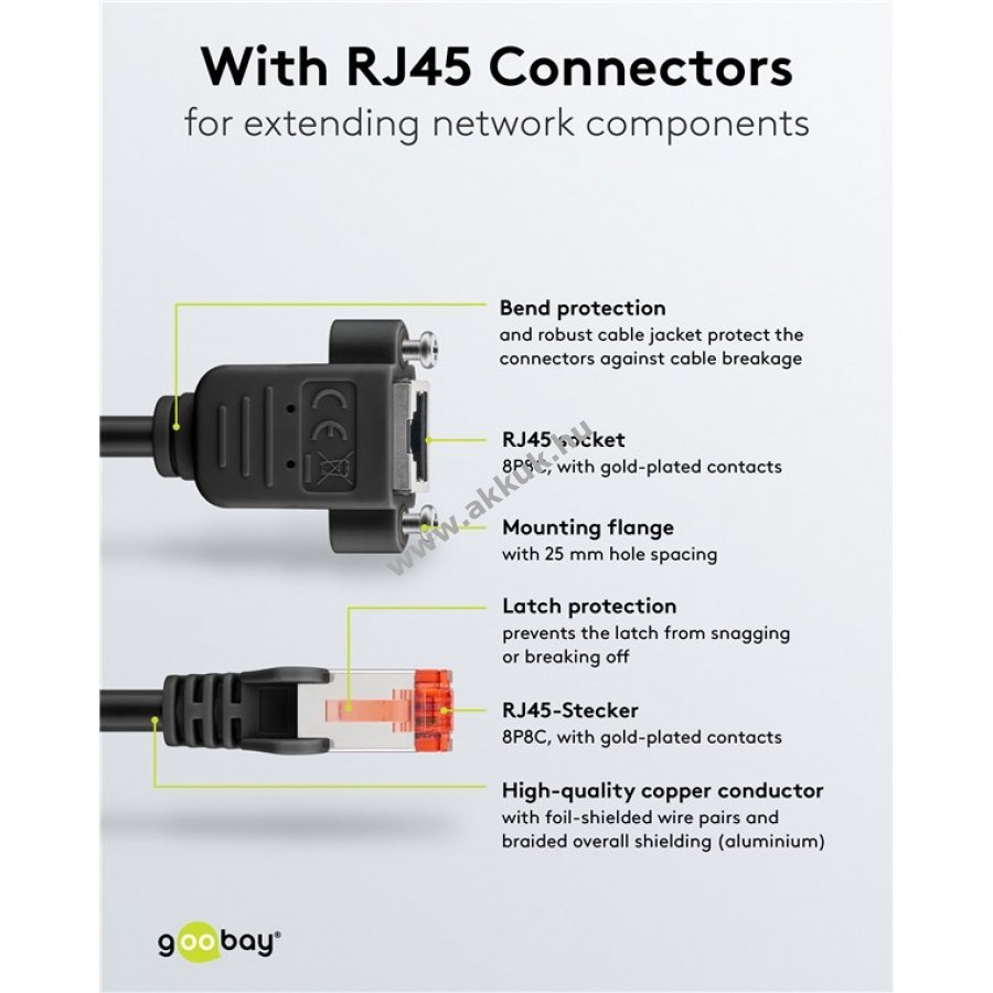 A Goobay CAT 6 kábel nagy sebességű és kiváló minőségű jelátvitelt biztosít stabil hálózati kapcsolat mellett. Kiváló minőségű réz belső vezetővel és aranyozott érintkezőkkel rendelkezik a megbízható kapcsolat érdekében. Halogénmentes külső köpeny védi a kábelt és csökkenti a károsanyag-kibocsátást.