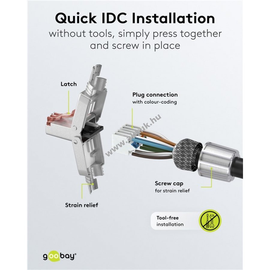 A RJ45 csatlakozó gyors és egyszerű szerelést tesz lehetővé a praktikus felnyitható mechanizmusnak köszönhetően. Az LSA szerelési technológia miatt nincs szükség külön szerszámra. A vezetékeket a színes jelölésű érintkezőkre kell helyezni és a csatlakozó házának összenyomásával rögzíteni.