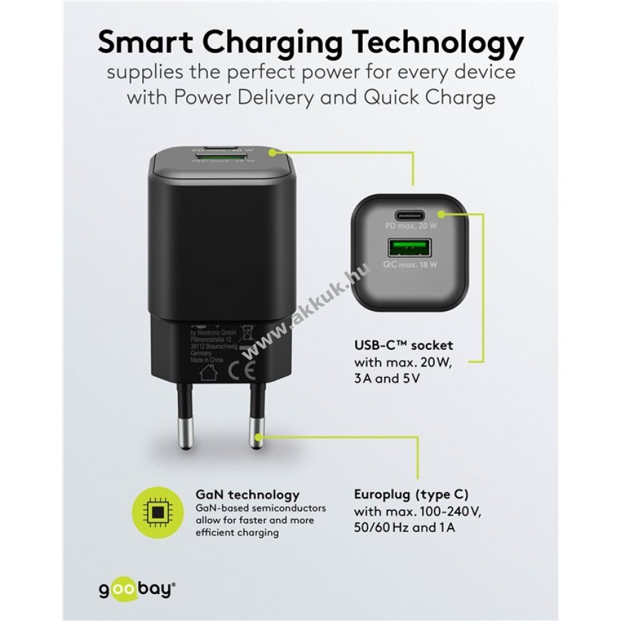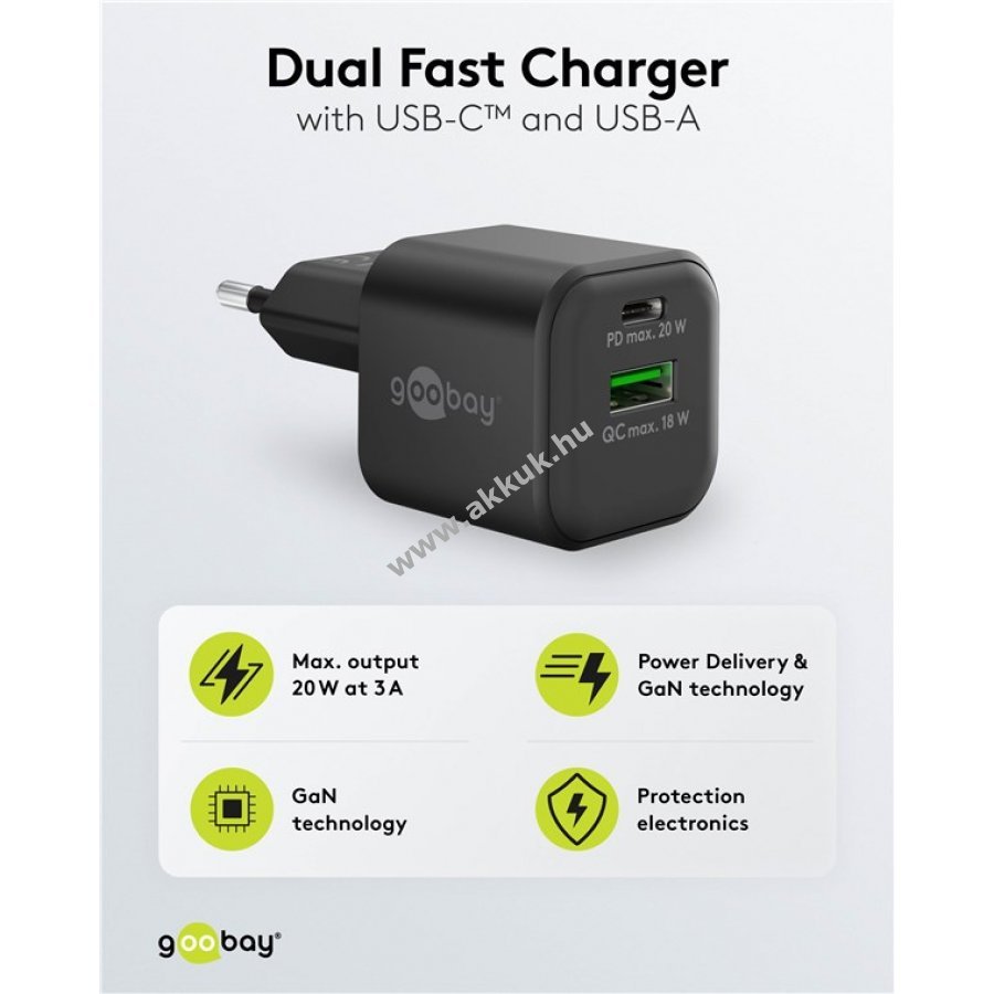 Kis méretű töltő otthoni és utazási használatra gyors és megbízható töltést biztosít okostelefonoknak és tableteknek 0-ról 50 százalékra 30 perc alatt a gyorstöltési módnak köszönhetően akár négyszer gyorsabb a hagyományos töltőknél 20 W teljesítmény ideális kisebb eszközökhöz mint okostelefonok Bluetooth fejhallgatók tabletek és e-könyv olvasók egyszerre két eszköz töltése USB-C porton okostelefonok USB-A porton fejhallgatók powerbankok kompakt és könnyű kialakítás minden táskába elfér GaN félvezető technológia gyorsabb és hatékonyabb töltést tesz lehetővé kisebb méret mellett Power Delivery és Quick Charge technológiák biztonságos és dinamikus töltést garantálnak optimális teljesítmény mellett kompatibilis Apple Samsung Xiaomi LG Huawei okostelefonokkal valamint Apple iPad és Samsung Galaxy Tab tabletekkel beépített védelem túláram túltöltés és túlmelegedés ellen