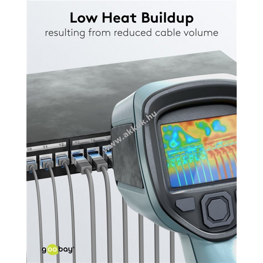 Ultravékony CAT 6A LAN-kábel extrarövid RJ45 csatlakozókkal a szerver szekrények és patchpanelek kisebb helyigényéért és jobb légkeringésért.