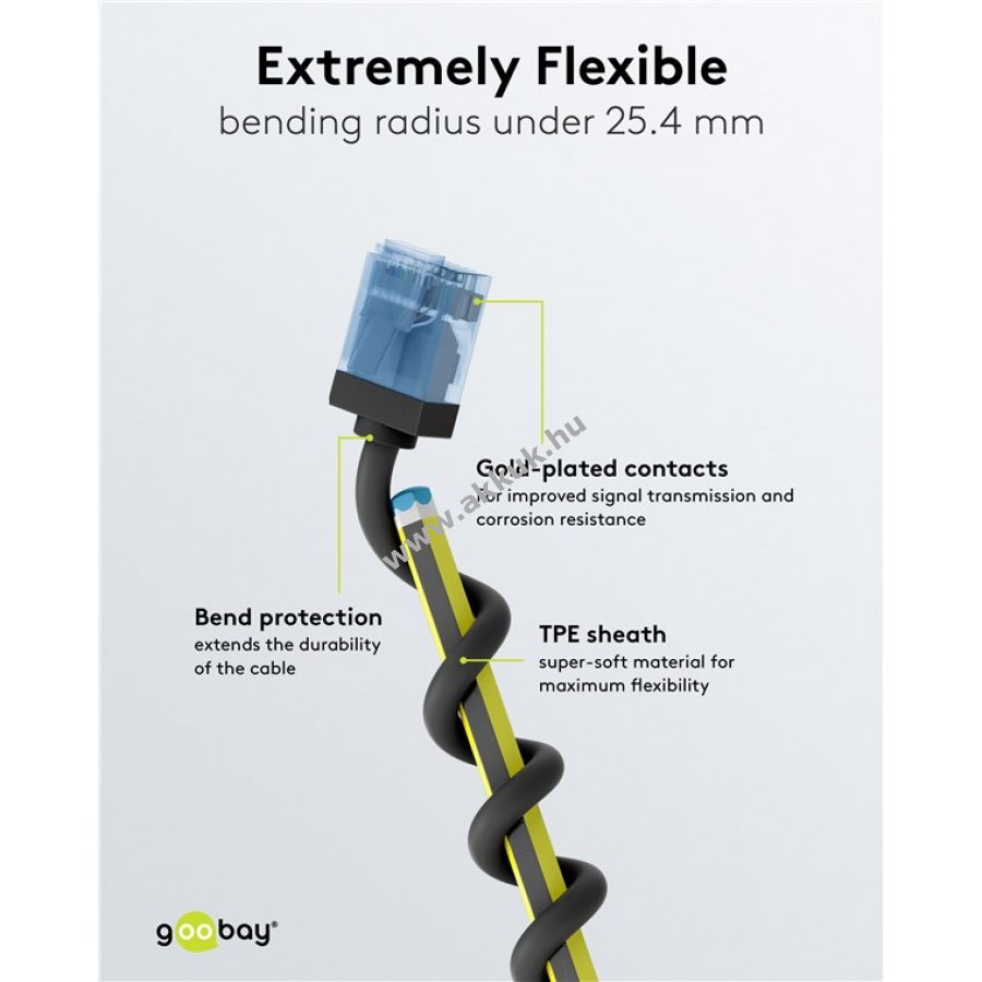 - Supervékony LAN kábel extrarövid RJ45 csatlakozókkal (15,3 mm) a kisebb helyigényért.