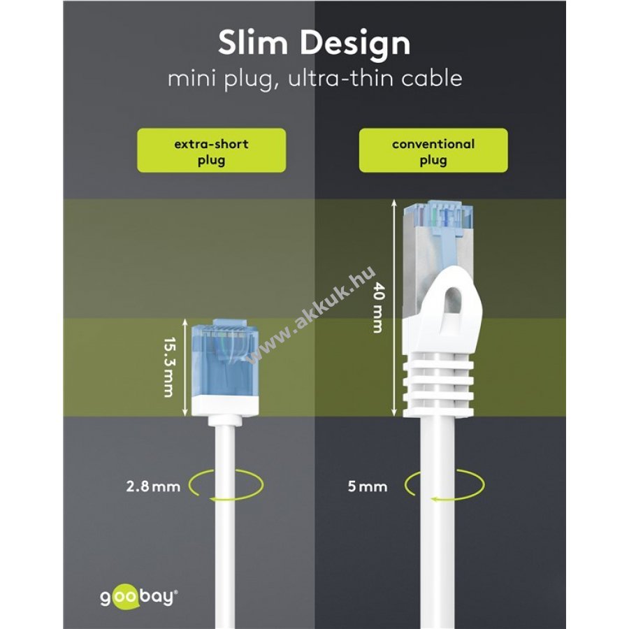 Ultravékony CAT 6A patchkábel extrarövid RJ45 csatlakozókkal a szerver- és patchpanelben csökkentett anyagigényért és jobb légáramlásért.