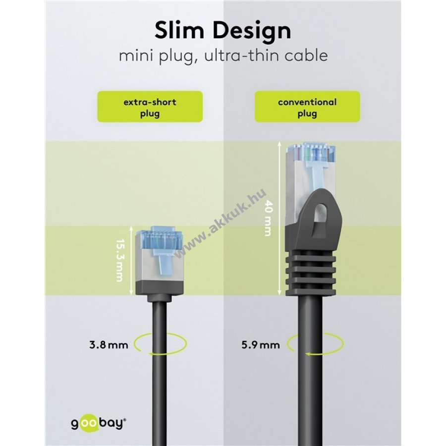 Ultravékony CAT 6A patchkábel extrarövid RJ45 csatlakozókkal a szerver szekrények és patchpanelek kisebb kábelterheléséért és jobb légáramlásért.