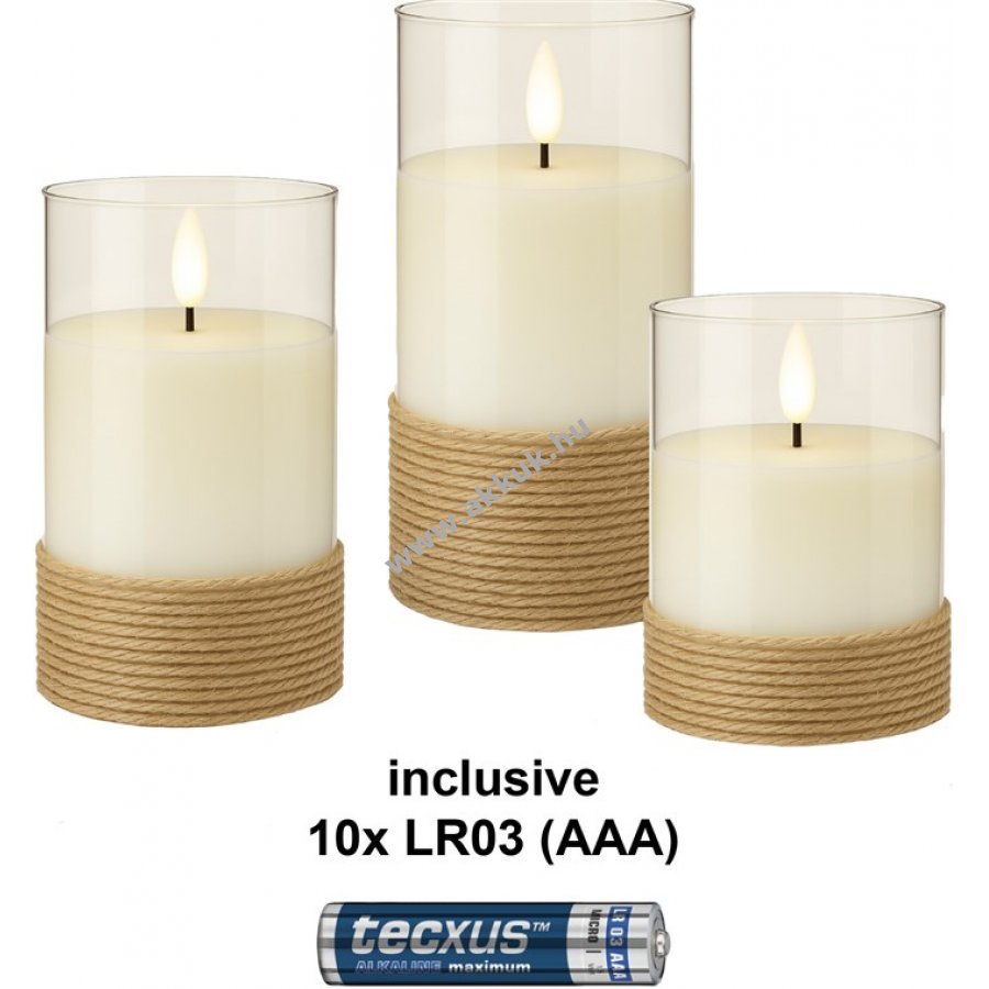 A gyertyák egyenként 3x AAA elemmel működnek és kapcsolóval valamint 6 órás időzítő funkcióval rendelkeznek ami 24 órás ciklusban ismétlődik.