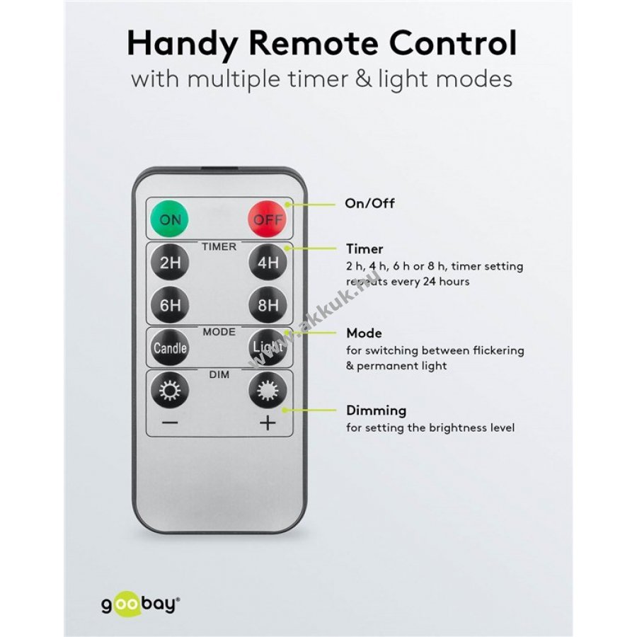 Távirányítóval állítható a pislákoló vagy állandó fény, a fényerő és az üzemidő (2 h, 4 h, 6 h, 8 h, 24 órás ismétlés).