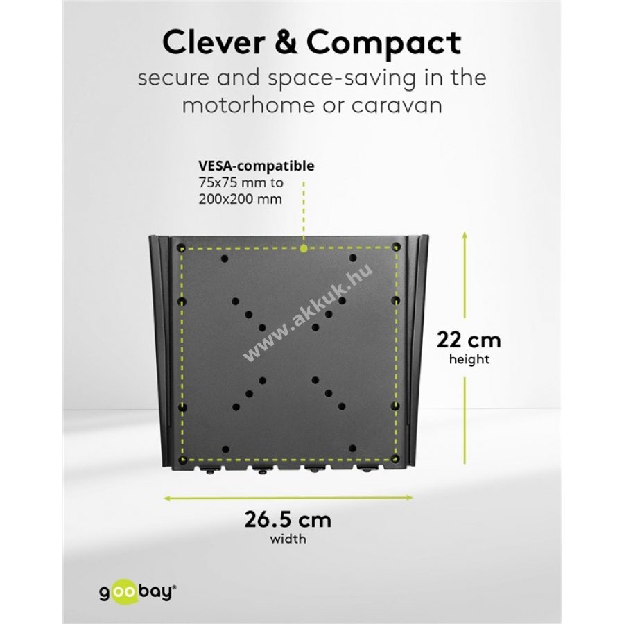A praktikus fali tartó segítségével a lakóautó mobil házimozivá válik televíziózásra filmnézésre és streamingre akár 42 hüvelykes képernyőméretig így útközben és nyaraláskor is szórakozást biztosít. Az ultravékony fali rögzítés optimálisan kihasználja a helyet a lakóautóban vagy lakókocsiban.