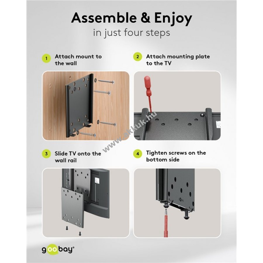 Egyszerű szerelés: először a TV-t a szerelőlemezre kell csavarozni majd a már felszerelt fali sínre felcsúsztatni.