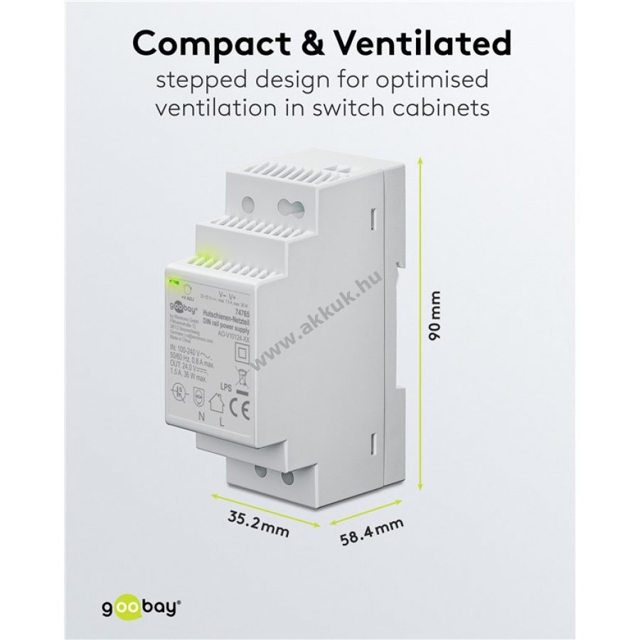 A 24V DC tápegység ideális épületautomatizáláshoz kis PLC-khez és biztonságtechnikai rendszerekhez, ahol több eszköz állandó egyenfeszültséggel és alacsony áramfelvétellel működik. Kompakt lépcsős kialakítása miatt szűk helyeken, például kapcsolószekrényekben vagy elosztódobozokban is jól használható. Alkalmas kaputelefonok, hálózatba kötött világítás, fűtés, szellőzés és riasztórendszerek vezérlésére. Különösen keskeny 35,2 mm szélességű, gyorsan és egyszerűen rögzíthető DIN-sínre kattintással. Bemeneti feszültsége 100-240V AC 50/60 Hz, kimenete állítható 20-29V DC között magas hatásfokkal. Védelmet nyújt túlfeszültség, túlterhelés és rövidzárlat ellen, IP20 védettségű, II. védelmi osztályú elektronikus szigeteléssel. Passzív konvekciós hűtéssel és érintésvédett csavaros kapcsokkal szerelt. Működését jelző folyamatosan világító LED mutatja.