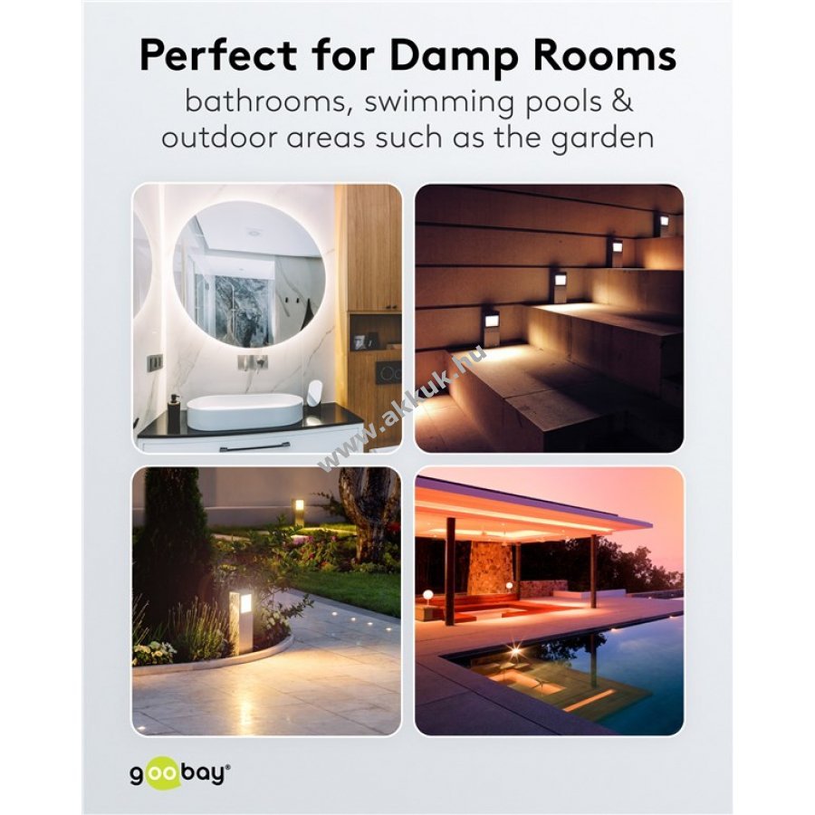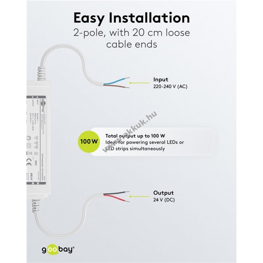 Kültéri és nedves helyiségekbe ideális, például fürdőszoba és kertvilágítás, tó- vagy medencevilágítás. Állandó feszültséget biztosít LED-eknek, így rugalmasan csatlakoztathatók különböző hosszúságú LED-szalagok. Robusztus tápegység minimális terhelés nélkül, alkalmas G4 és GU-5.3 LED spotok, LED-szalagok és LED-modulok táplálására 220-240 V hálózatról. 24 V állandó feszültség lehetővé teszi párhuzamos kapcsolásban az egyedi LED-ek és változó hosszúságú szalagok használatát. IP67 védelem kültéri, nedves és ipari környezetben is alkalmazható. Hosszú kábelhosszokhoz és akár 100 W teljesítményű LED-szalagokhoz megfelelő. Bemenet és kimenet 20 cm-es, 2 eres szabad kábellel a könnyű szerelésért. Védett túlfeszültség és rövidzárlat ellen, elektronikus szigeteléssel, II. védettségi osztály. Méretek 193 x 52 x 37 mm. Nem dimmelhető.