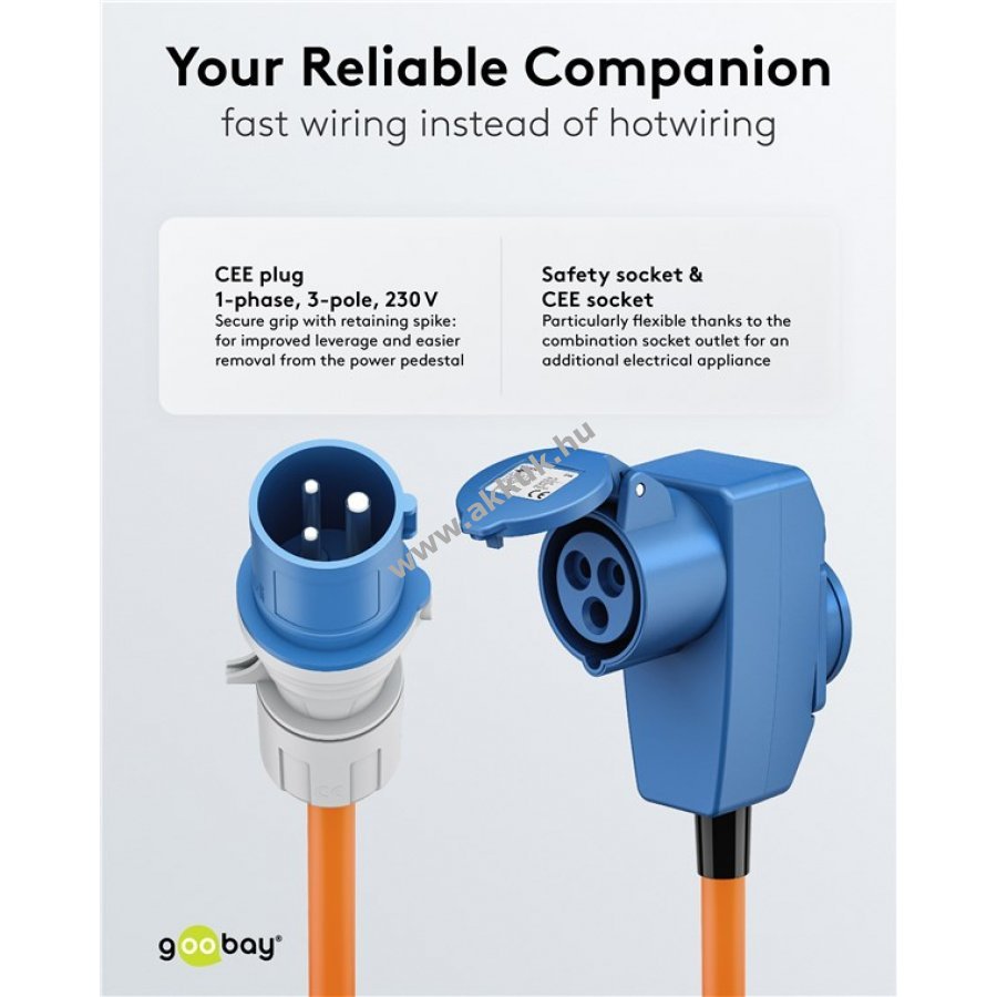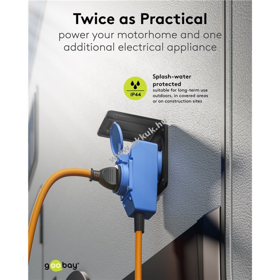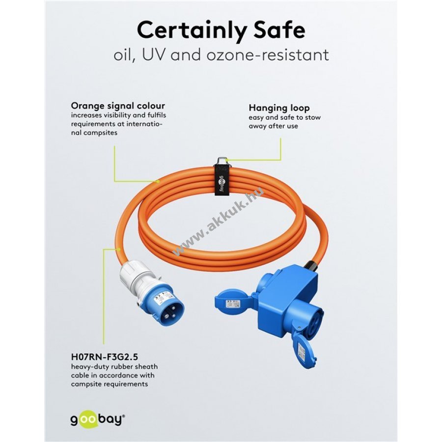 Megbízható áramellátás lakóautóhoz kempingben és kültéren. 90°-os CEE csatlakozó kényelmes helytakarékos csatlakoztatást tesz lehetővé. IP44 védelem biztosítja a hosszú távú kültéri használatot fedett helyeken és építkezéseken. Narancssárga kábel a jobb láthatóságért és biztonságért kempingeken. Önzáró kupakok védik a csatlakozókat portól és sérülésektől. Masszív H07RN-F 3G2,5 gumikábel olaj-, UV- és ózonálló.