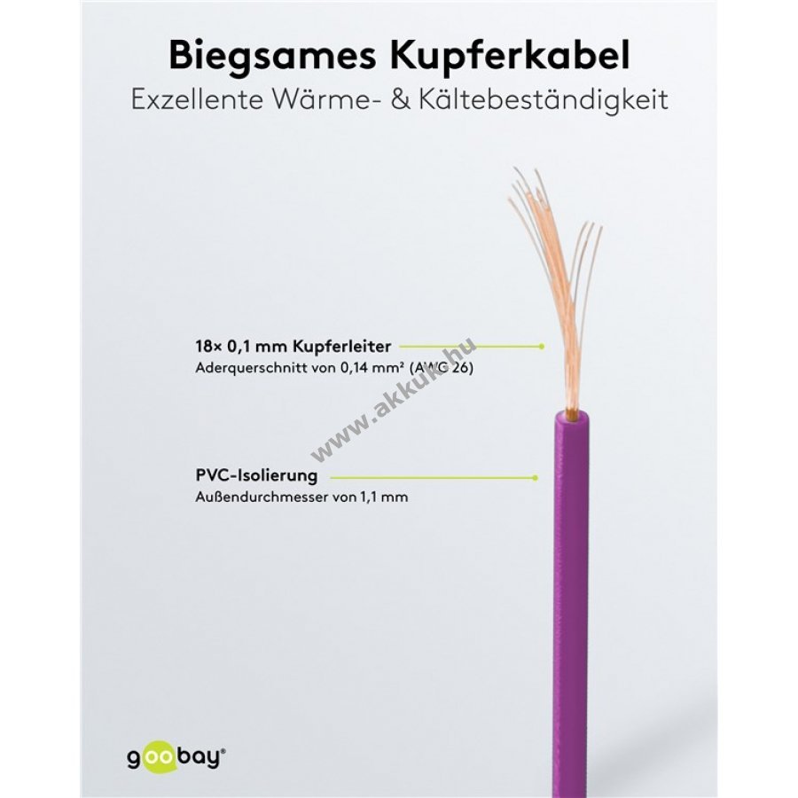 Szigetelt, rugalmas réz sodort vezeték 10m hosszban PVC szigeteléssel, lila színben. Keresztmetszet 0,14mm2 (AWG26), külső átmérő 1,1mm.