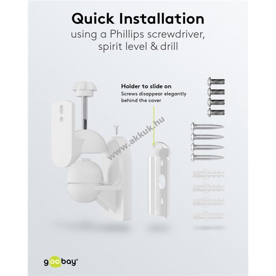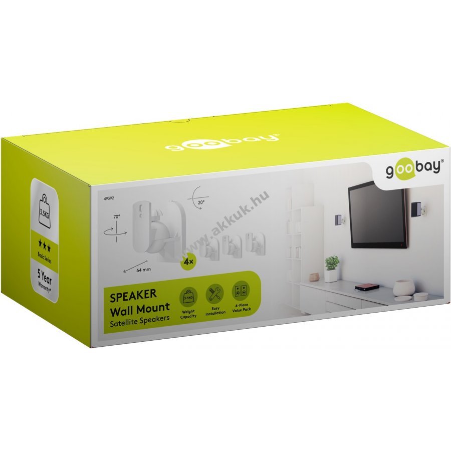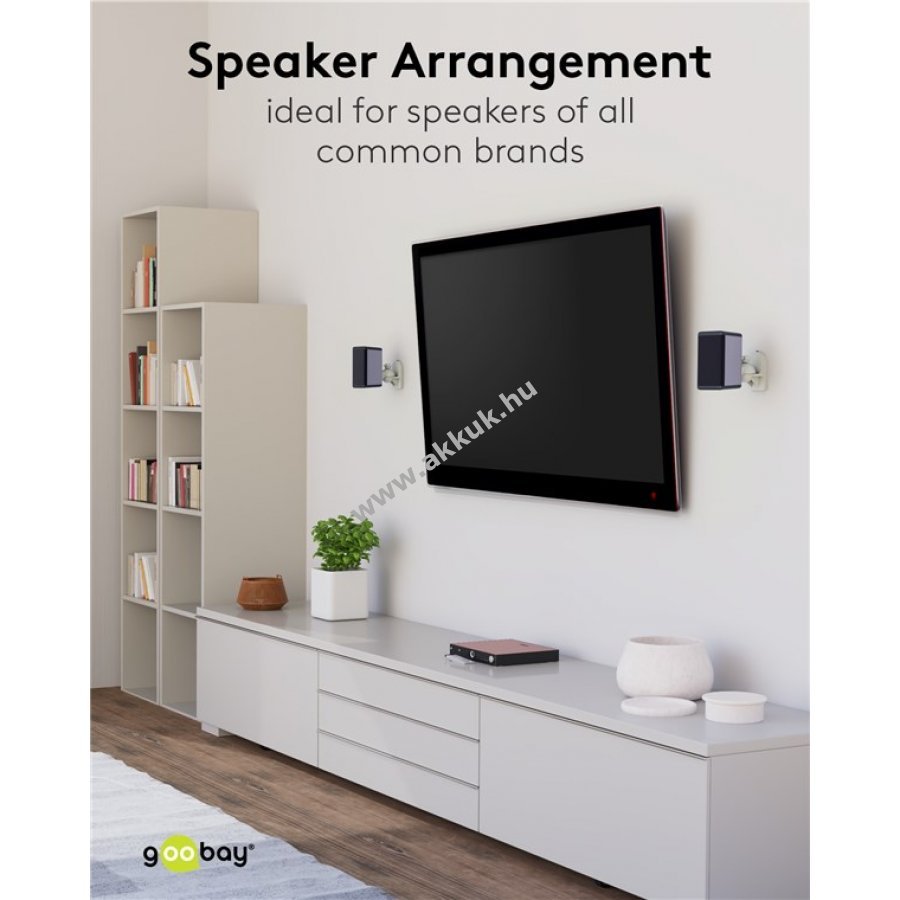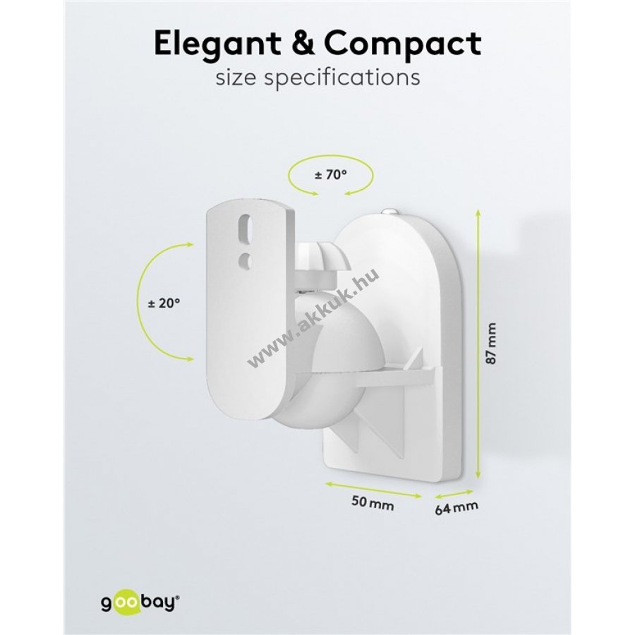 Univerzális fali tartó műholdas hangszórók egyszerű és gyors felszereléséhez. A fali lemezt rögzítve a tartó könnyen felhelyezhető a hangszóróra. A kerek fejcsuklóval szerszám nélkül állítható a kívánt pozíció. Teljes mozgásszabadság minden irányban és biztonságos rögzítés. Alkalmas 3,5 kg-ig terjedő hangszórókhoz otthoni mozirendszerekhez, surround és HiFi rendszerekhez. A hangszóró falhoz való távolsága 6,4 cm. A fejcsukló 20°-ban dönthető és 70°-ban forgatható. A rögzítő gombbal egyszerűen és szerszám nélkül rögzíthető a pozíció. A fali lemez és a rögzítő csavarok esztétikusan takarva maradnak. Kompatibilis a legtöbb ismert márka hangszóróival, például Bose B&O Canton Harman Kardon LG Magnat Philips Pioneer Samsung Sony Teufel Yamaha.