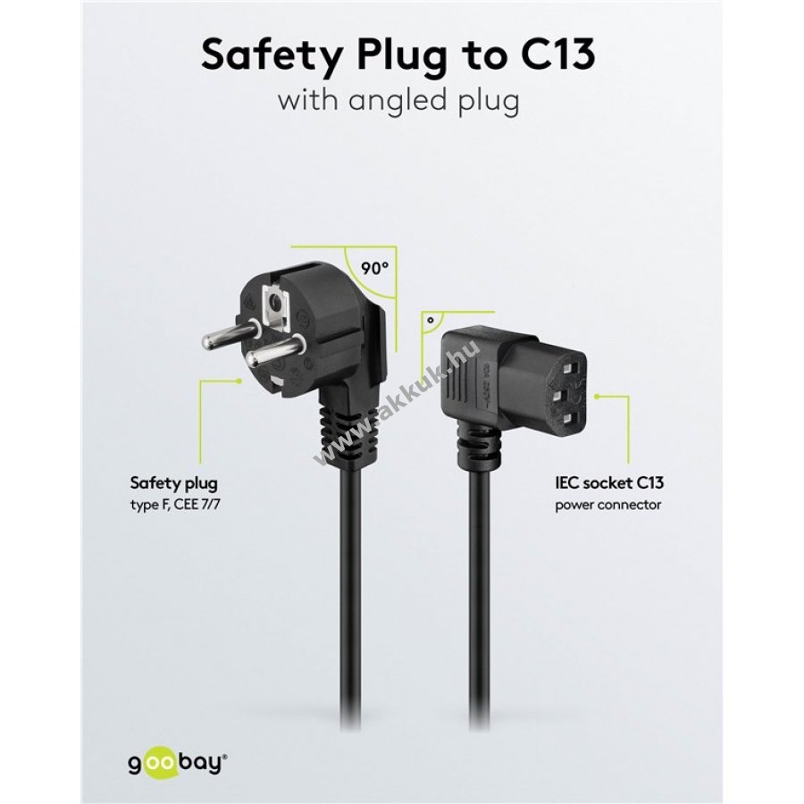 Univerzálisan használható hálózati kábel szögletes C13 csatlakozóval és szögletes fém érintkezős dugóval. Alkalmas PC, monitor, projektor, laptop és más készülékekhez C14 csatlakozóval. Ideális használt kábel cseréjéhez.