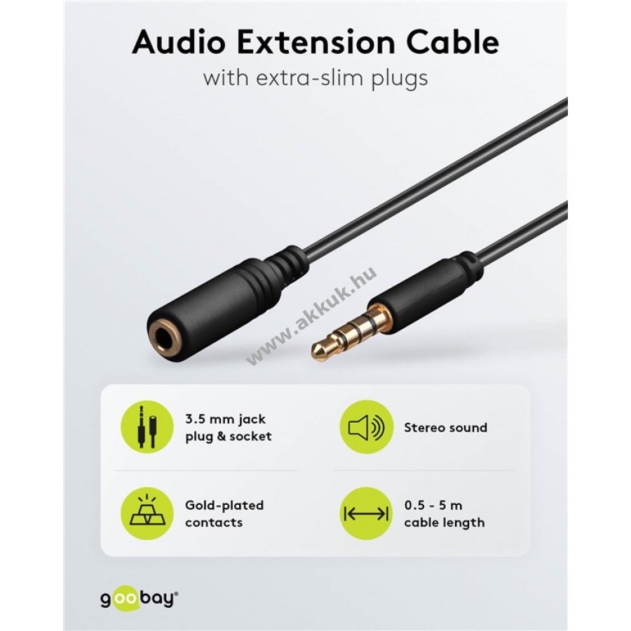 Goobay audio hosszabbító kábel 3,5 mm 4-pólusú sztereó csatlakozóval alkalmas fejhallgatók és egyéb audioeszközök hosszabbítására.