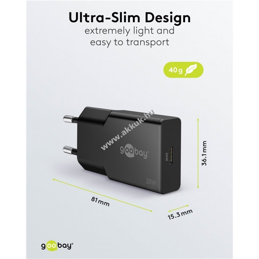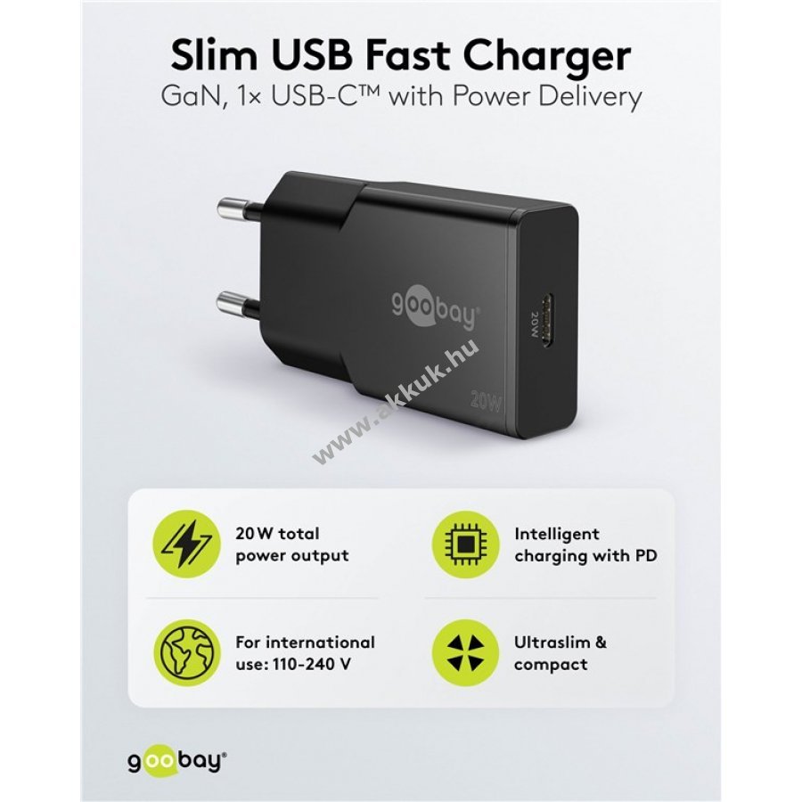 A Goobay Slim sorozat nagyon vékony töltőket kínál utazók számára. Kisméretű, így minden táskába és csomagba könnyen elfér. Ideális okostelefonok, tabletek és okosórák töltésére útközben. 20W teljesítményével kifejezetten kisebb eszközökhöz, például okostelefonokhoz, Bluetooth fülhallgatókhoz, tabletekhez vagy powerbankokhoz készült. Kompakt kialakítása miatt praktikus utazáshoz. GaN technológiájú félvezetők gyorsabb és hatékonyabb töltést tesznek lehetővé, valamint kisebb és könnyebb kialakítást biztosítanak a hagyományos töltőkhöz képest. Power Delivery támogatásával biztonságos és dinamikus töltést nyújt, amely optimalizálja a csatlakoztatott eszköz teljesítményét. Kompatibilis Apple iPhone, Samsung, Xiaomi, LG, Huawei okostelefonokkal, valamint Apple iPad és Samsung Galaxy tabletekkel. Beépített védelmi áramkör védi az eszközöket túláram, túltöltés és túlmelegedés ellen.