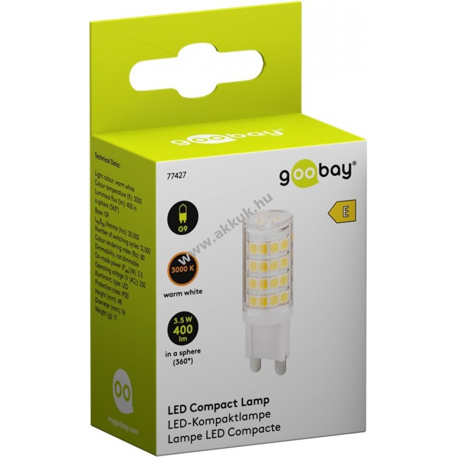 A 3,5W teljesítményű Goobay LED-lámpa 40W izzó fényerejét nyújtja de körülbelül 88% energiát takarít meg Kompakt méretű átmérő 16 mm magasság 48 mm A G9 LED kiváltja a G9 halogénlámpákat például beépített spotokban vagy mennyezeti lámpákban 400 lumen fényerő és melegfehér 3000 K ideális íróasztali lámpákhoz LED aláépítésekhez vitrinekhez vagy tükrös szekrényekhez Alacsony hőkibocsátás és azonnali fénykapcsolás 80 Ra színvisszaadás természetes megjelenítés 20 000 óra élettartam hosszú távú megbízhatóság