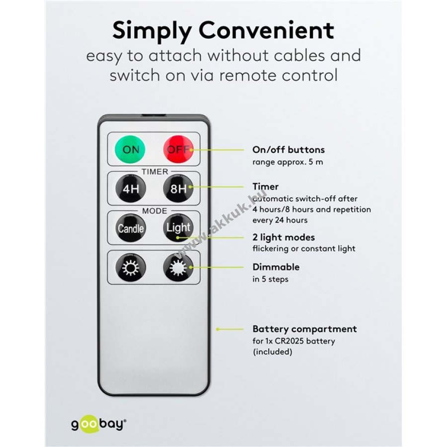 Elemigény: gyertyákhoz 10x AAA mikroelem (nem tartozék), távirányítóhoz 1x CR2025 elem (tartozék).