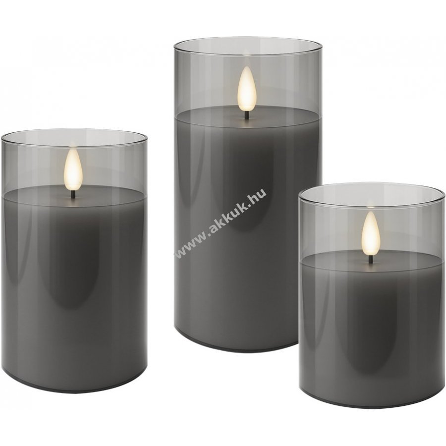 - Három különböző méretű gyertya szürke üvegben