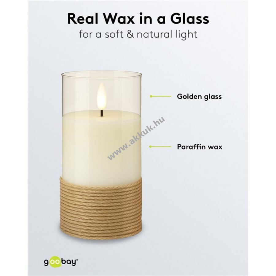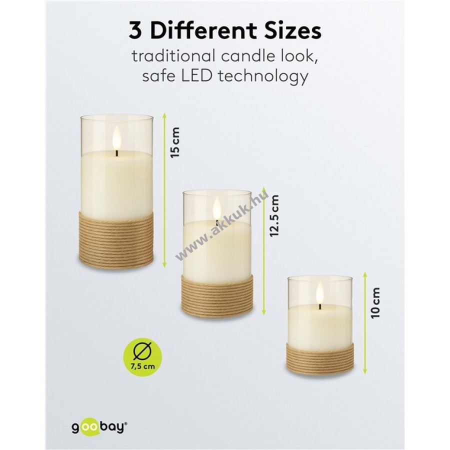 A valódi viaszos gyertyák klasszikus eleganciája és a modern biztonságos LED technológia kombinációja. A gyertyák valósághű, vibráló lánghatást és viaszos bevonatot kínálnak meleg fehér fényben 2700 K színhőmérséklettel. 3 különböző méretű, üvegbe zárt, kenderrel körbetekert gyertya, teljesen elektromos és biztonságos. 3D kanóc és természetes anyagok rusztikus megjelenést és lágy, természetes fényt biztosítanak ünnepi és egyéb alkalmakra. Külön-külön vagy dekorációs elemekkel együtt használható. Bekapcsoló és 6 órás időzítő funkció 24 órás ciklussal. Tűzveszély nélküli világítás emberek és állatok számára, ideális helyeken, ahol valódi gyertyák nem használhatók. Méretek: 10 x 7,5 cm, 12,5 x 7,5 cm, 15 x 7,5 cm. Minden gyertya 3x AAA elemmel működik (nem tartozék). Védeni kell nagy hőtől és erős napsütéstől, különben olvadás léphet fel.