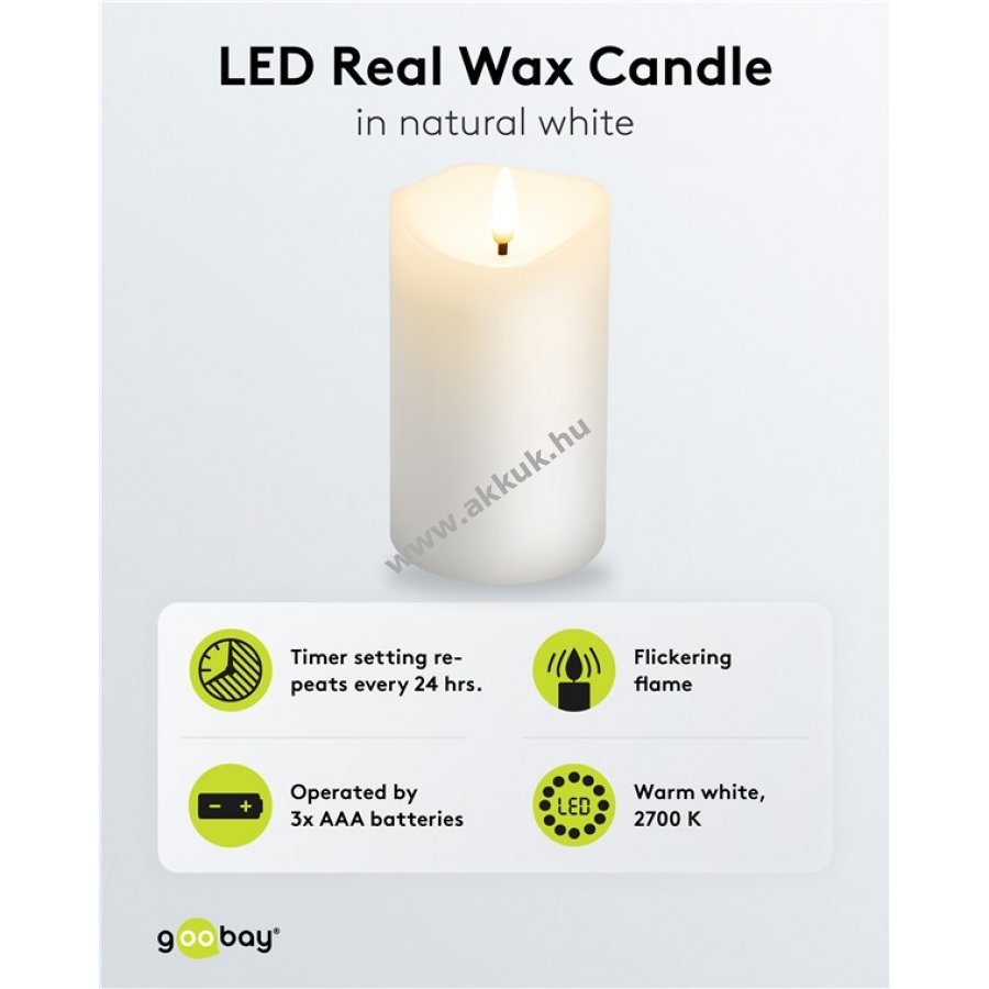 - stílusos, elektromos viaszgyertya valódi viaszburkolattal - természetes, vibráló lánghatás - beépített kapcsoló és 6 órás időzítő 24 órás ismétléssel - elemmel működik 3x AAA (nem tartozék) - méret 12,5 cm magas 7,5 cm átmérő - nem alkalmas nagy hő vagy erős napfény közelébe