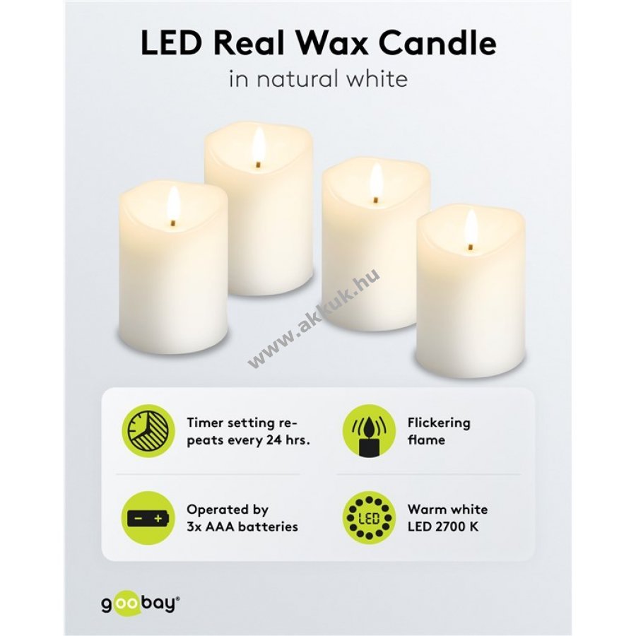 A gyertyák valósághű, vibráló lánghatást keltenek viaszburkolattal anélkül, hogy leégnének vagy füstölnének.