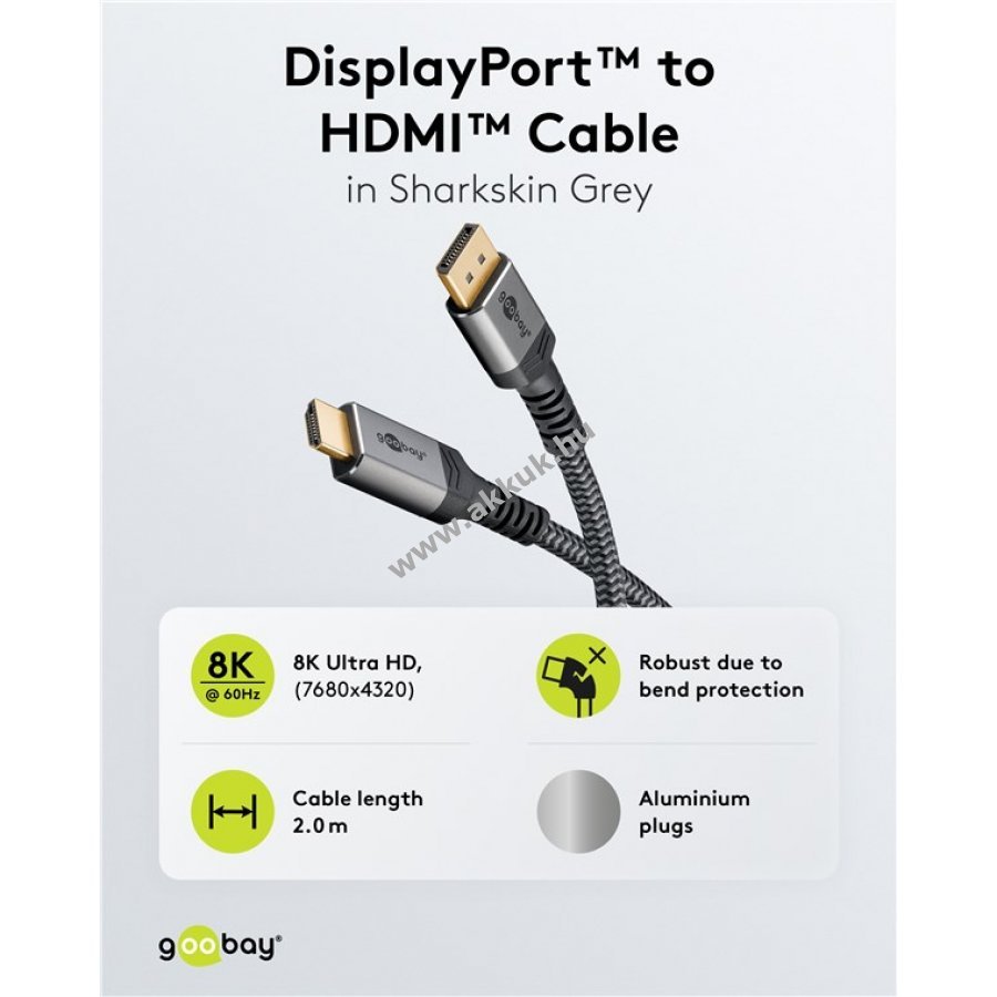 A Goobay Plus sorozat vékony fém kivitelben Sharkskin szürke színben. Kényelmes megoldás DisplayPort forrás csatlakoztatására HDMI csatlakozós televízióhoz vagy monitorhoz akár 8K felbontással és kiváló hangminőséggel olyan eszközök esetén, amelyek nem rendelkeznek DisplayPort csatlakozóval.