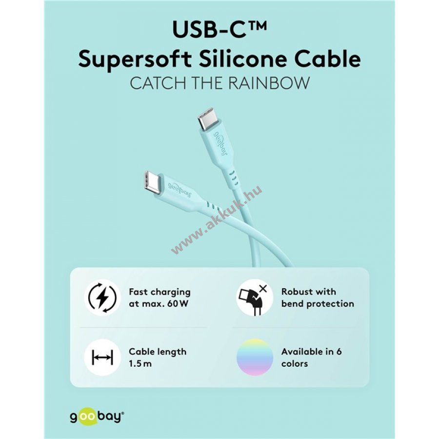 Puha és tartós szilikonborítású USB-C kábel 1,5 m hosszban kékeszöld színben.