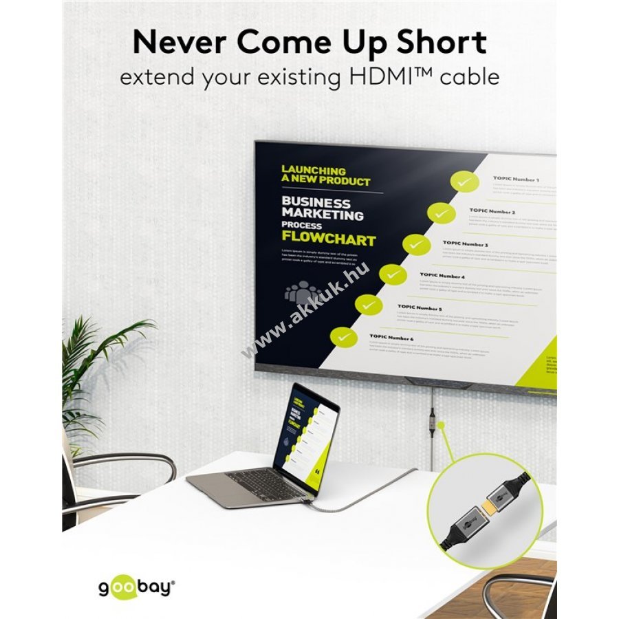 A Goobay Plus sorozat vékony elegáns fém dizájnban Sharkskin szürke színben. Rövid vagy nehezen elérhető HDMI kábelek meghosszabbítására alkalmas például Smart TV stick csatlakoztatásához. Ultra Speed támogatással és teljes 8K UHD felbontással kiváló képminőséget és otthoni szórakozást biztosít.