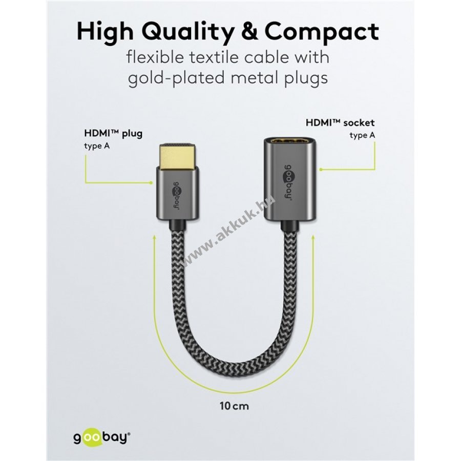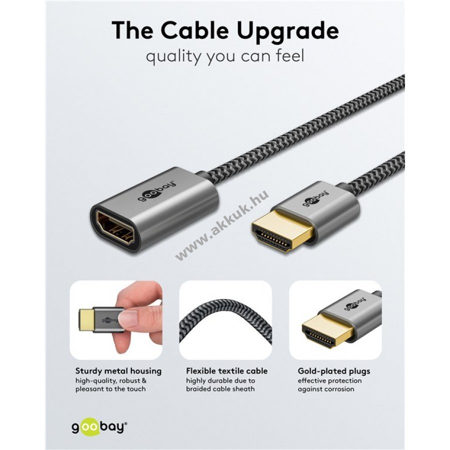A Goobay Plus sorozat karcsú fém kivitelben Sharkskin szürkében készült. Az ultra modern HDMI kábel kiemelkedő felbontást és gyors adatátvitelt biztosít, támogatja az ARC, HDR és 3D funkciókat.