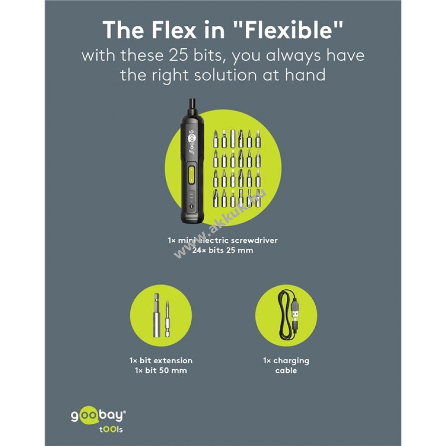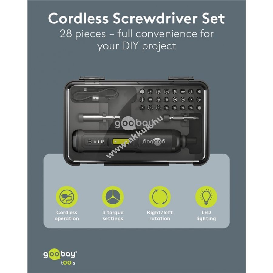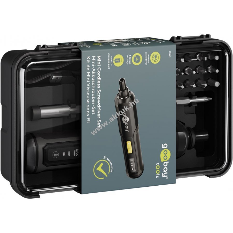 Kompakt és kézreálló mini akkus csavarozó praktikus készletben otthoni és hobbi használatra. 3 fokozatú nyomatékszabályozás 1 Nm 2 Nm vagy 3 Nm mindkét irányban. Integrált előlapi LED világítás a jobb láthatóságért. Gumírozott markolat kényelmes fogást biztosít hosszabb munkák során. 24 bit különböző típusokkal 4 lapos 8 kereszt 4 hatszög 4 négyszög 4 belső hatszög plusz 1 kereszt bit 50 mm hosszban. 1 bit hosszabbító 60 mm hosszú. Kompakt műanyag doboz átlátszó fedéllel a könnyű tárolásért. USB-C™-USB-A kábel 0,5 m hosszú a lítium-ion akkumulátor töltéséhez.
