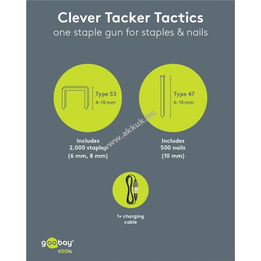 A csomag tartalma: 1000 db 8 mm-es kapocs, 1000 db 6 mm-es kapocs, 500 db 10 mm-es szeg.