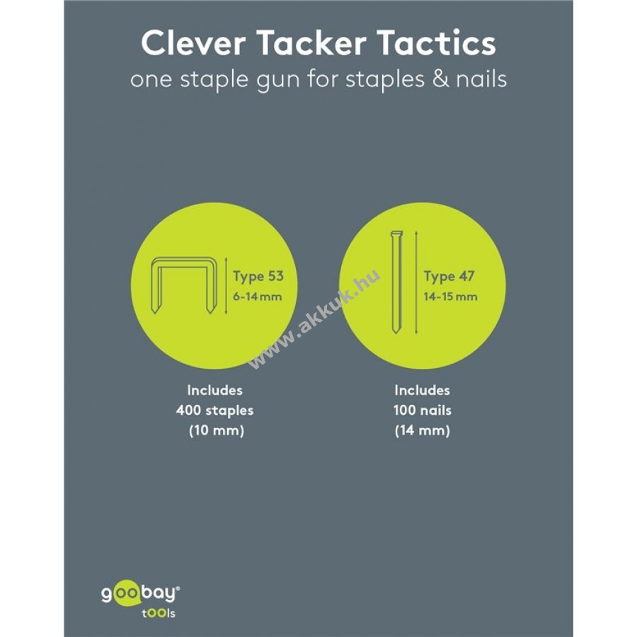 - Tartozék: 400 db 10 mm-es kapocs és 100 db 14 mm-es szeg