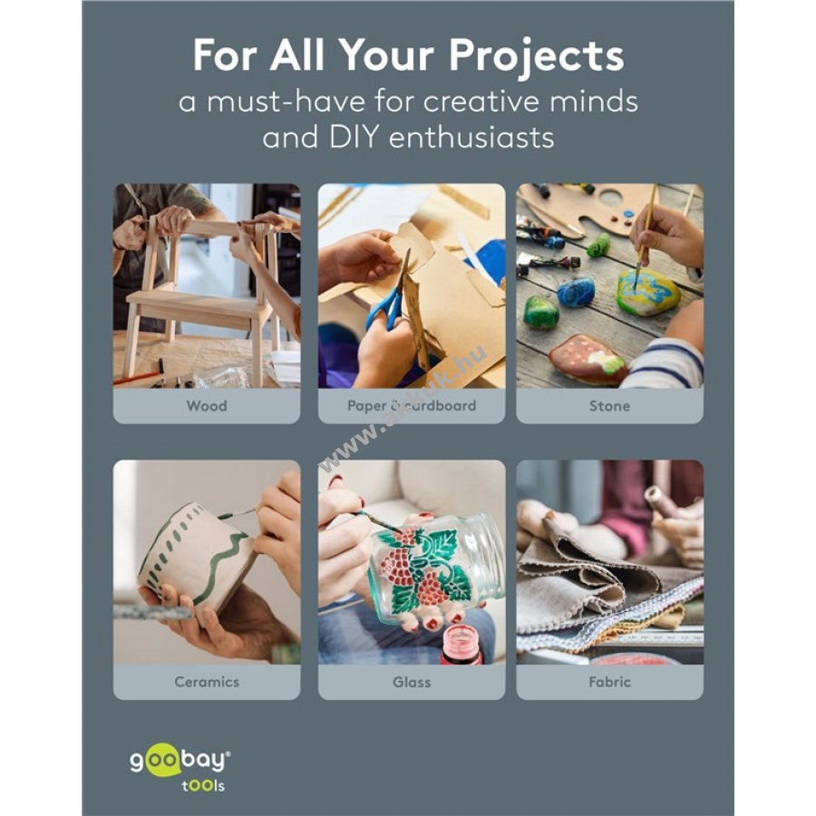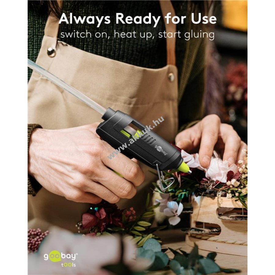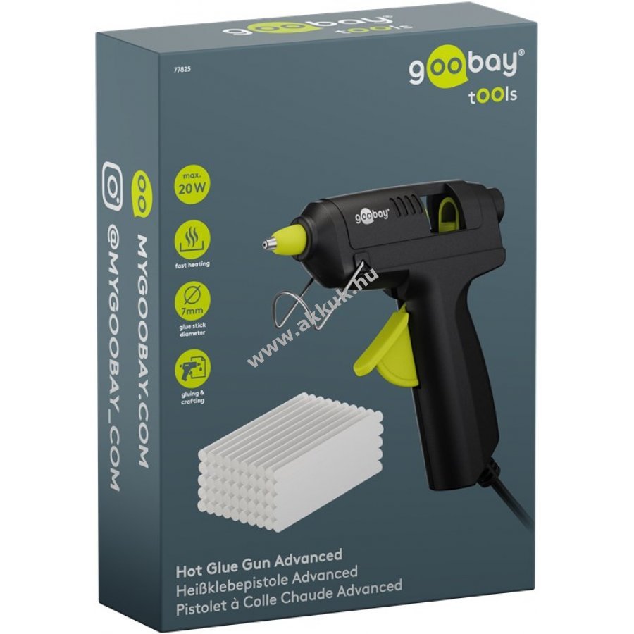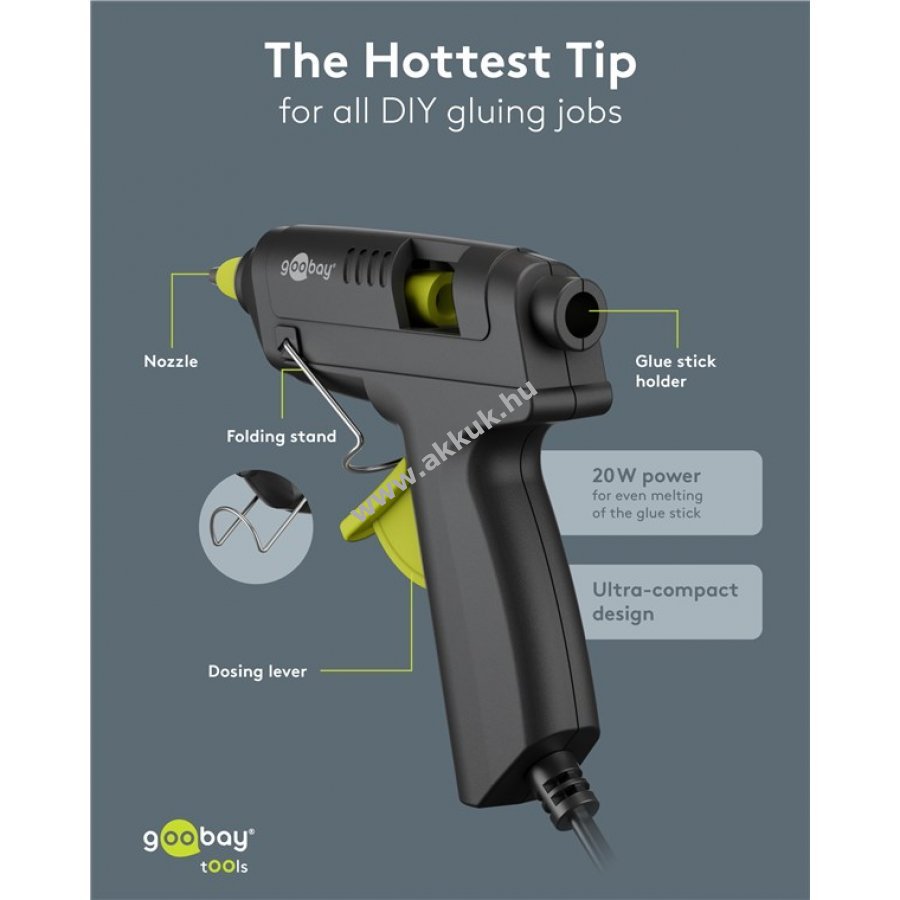 Praktikus eszköz kreatív és barkács munkákhoz gyors és megbízható ragasztást biztosít. 20W teljesítményű melegragasztó pisztoly 7 mm átmérőjű ragasztórudakhoz. 10 g/perc adagolás mechanikus előtolással egyenletes felvitelt tesz lehetővé. Alkalmas karton, kerámia, fa, fém, bőr, akril és üveg ragasztására. Kényelmes kihajtható állvánnyal rendelkezik, amely megakadályozza a felület sérülését. Hővédő burkolat csökkenti az égési sérülések kockázatát. Hálózati táplálás 110-240 V feszültséggel és 1 m hosszú kábellel.