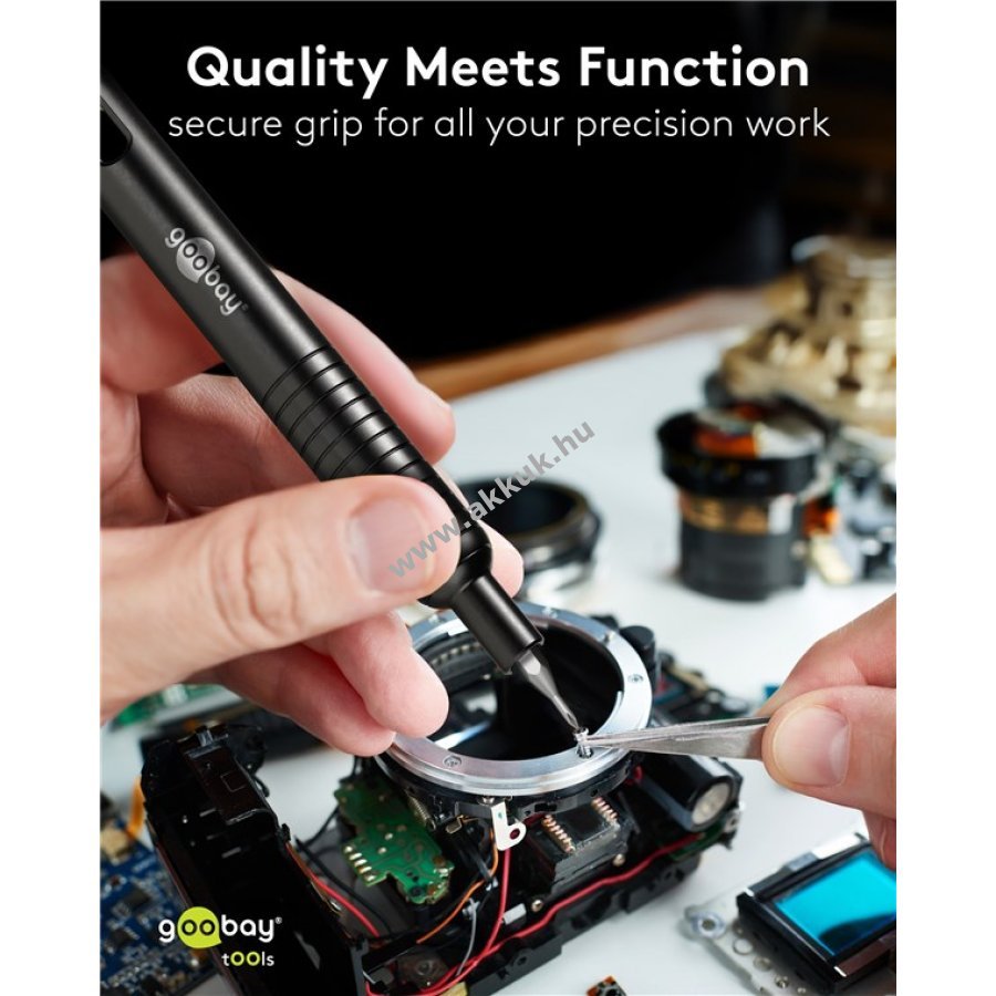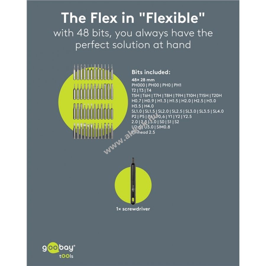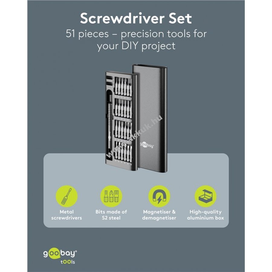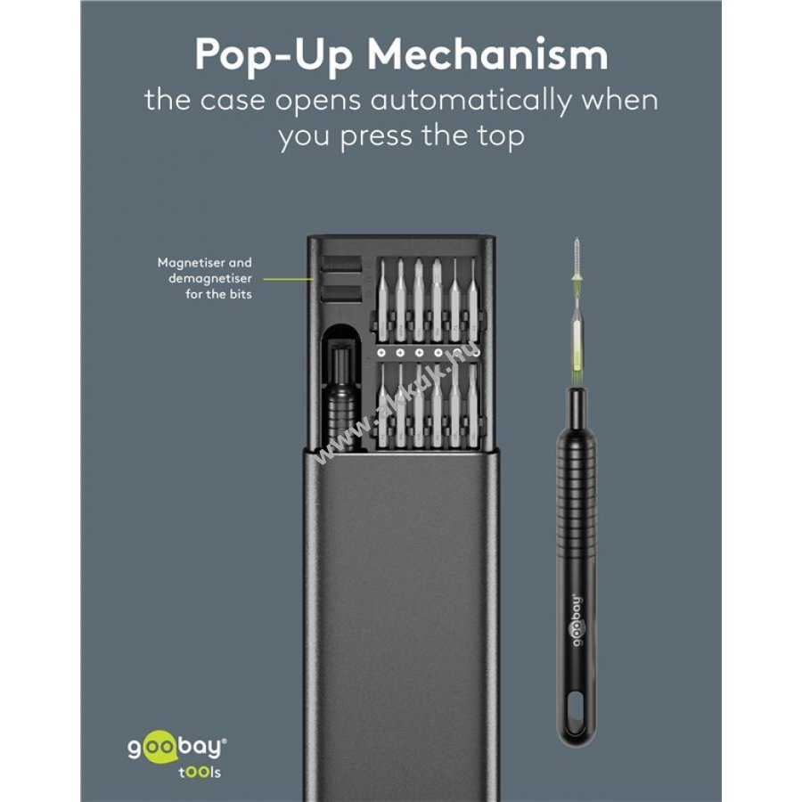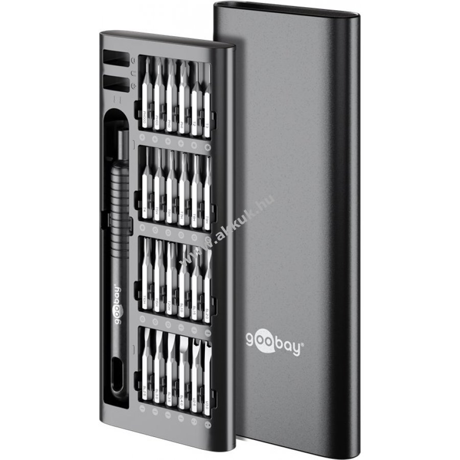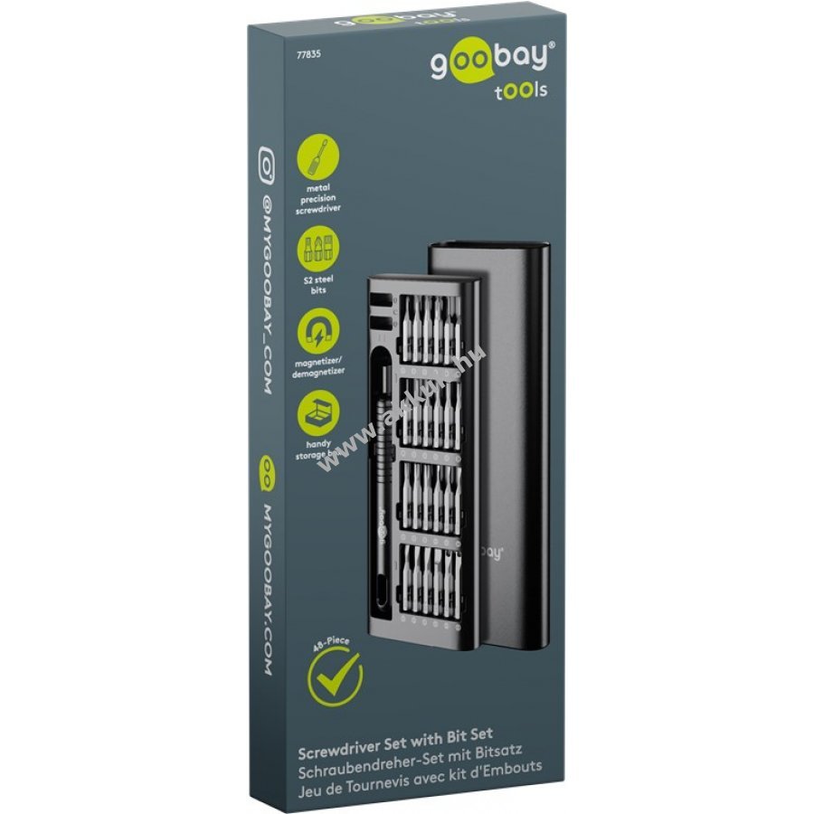 Minőségi matt alumínium ház és színben harmonizáló bit tartó jellemzi a készletet. A tok felnyitható pop-up mechanizmussal rendelkezik ami megakadályozza a zár törését és biztonságosan zár a szállítás vagy tárolás során. 48 precíziós bit 4 mm átmérővel és 28 mm hosszúsággal a könnyebb azonosítás érdekében jelölve a biten és a tokban képpel is. Bit tartó 15,7 cm hosszú fém anyagból csúszásgátló barázdákkal. Ideális elektronikai precíziós munkákhoz laptopon, PC-n, okostelefonon vagy drónon, továbbá órás- és finommechanikai feladatokhoz. A tok mágneses rekeszei szükség esetén mágnesesítik vagy demágnesesítik a biteket. 48 bit tartalom: 4x kereszt (PH) 11x belső hatszög (T, TH) 9x hatszög (H) 7x lapos 3x 5-pontos (P) 4x Tri-Wing 3x háromszög 3x belső négyszög (S) 2x Spanner (U) 1x SIM0.8 1x Pinhead 2,5