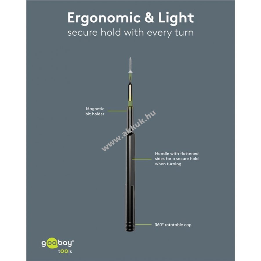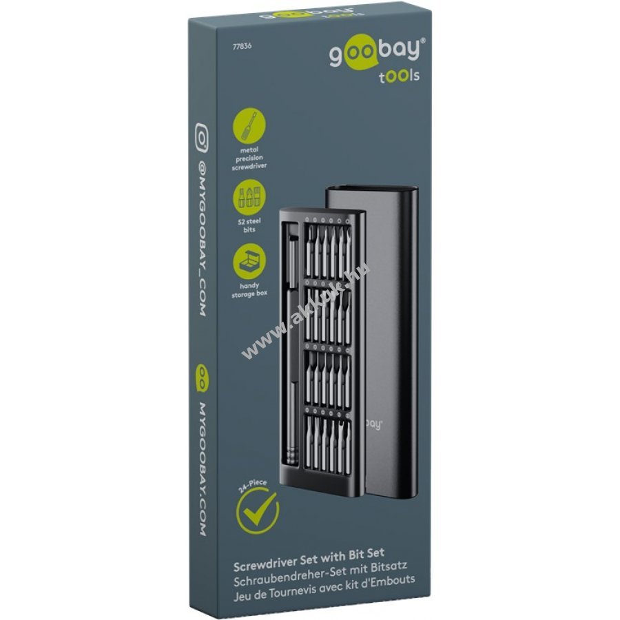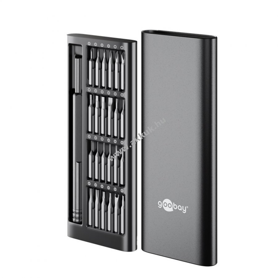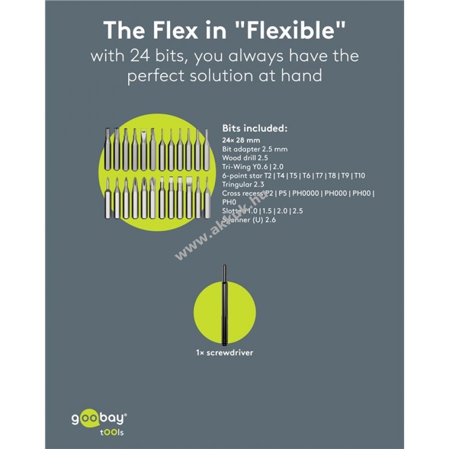 Tartozékok: 1x 2,5 mm adapter 8x belső hatszög (T TH) 1x háromszög (2,3) 6x kereszt (PH P) 4x lapos 1x feszítő (2,6) 2x Tri-Wing (0,6 2,0) 1x fához való fúró (2,5).