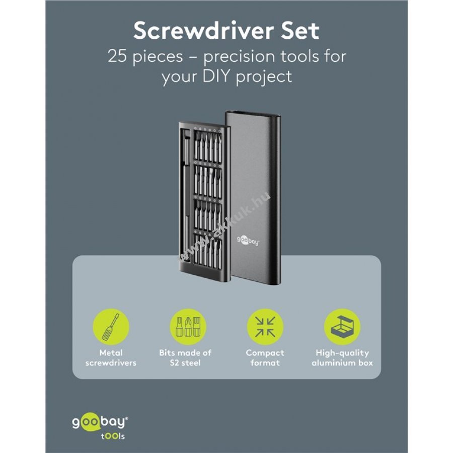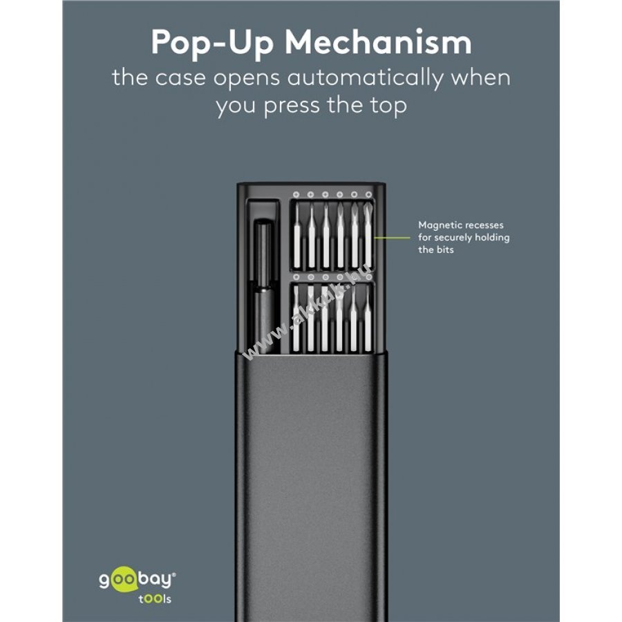 Minőségi csavarhúzó készlet matt alumínium házzal és színkódolt bit tartóval. A tok pop-up mechanizmussal nyitható ami megakadályozza a zár törését és biztonságosan zár a szállítás vagy tárolás során.