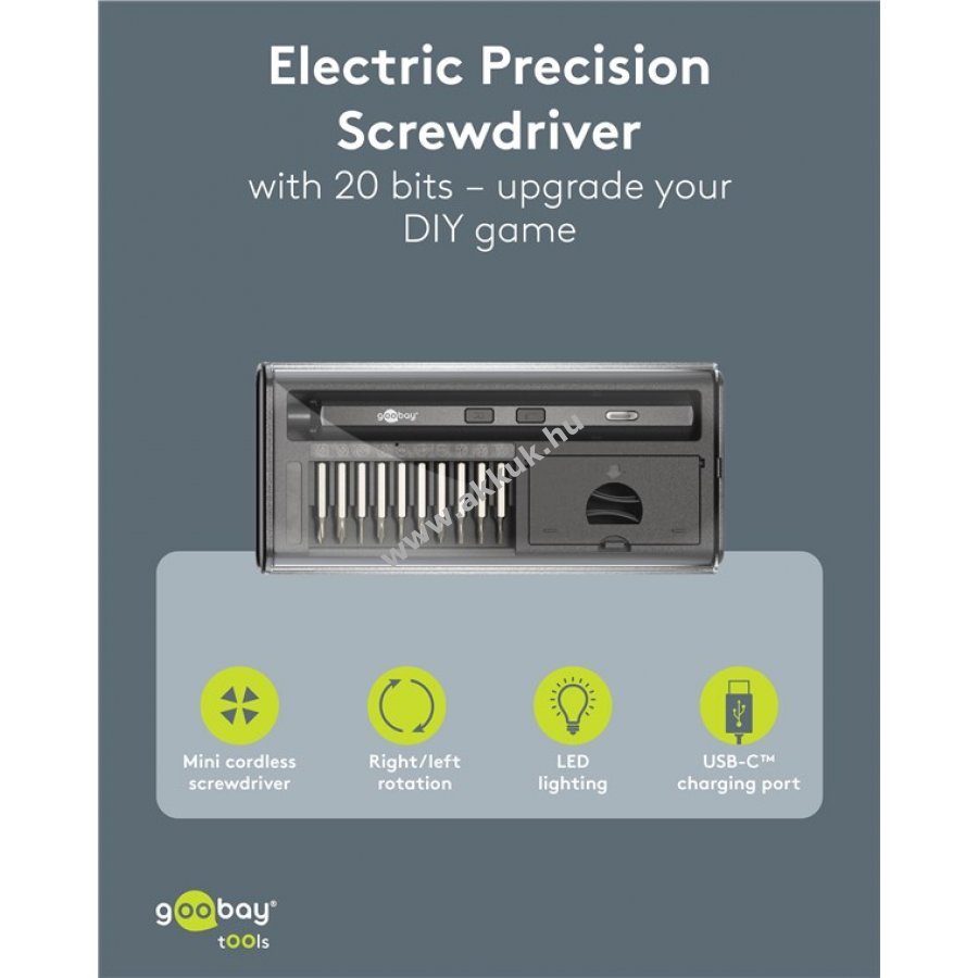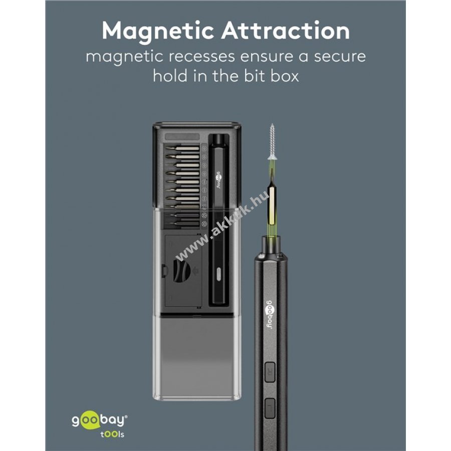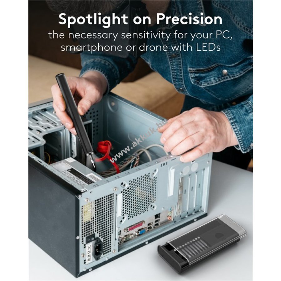 Alumínium házával elegáns és kényelmes használatot biztosít. A tok mágneses mélyedéseiben a bitek biztonságosan rögzülnek. 20 precíziós bit tartozik hozzá különböző típusokkal és méretekkel a pontos munkához. A vékony, könnyű csavarhúzó jól illeszkedik a kézbe, ideális finommechanikai, számítógép és okoseszköz javításhoz. 4 előre irányuló LED megvilágítja a csavarozási pontot árnyék nélkül. Két forgásirány és színes LED sáv jelzi az akkumulátor állapotát. USB-C csatlakozóval tölthető, a csomagban 39 cm-es USB-C-USB-A töltőkábelt található.