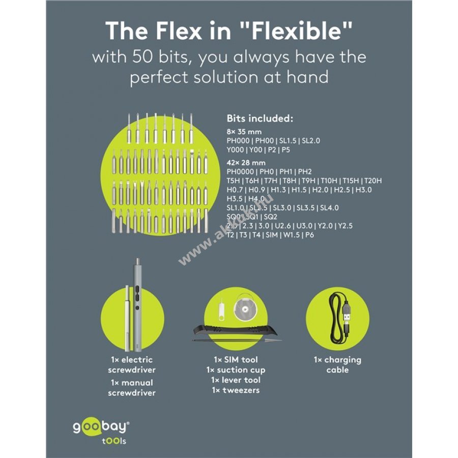 A készlet 50 bitet tartalmaz 28 mm és 35 mm hosszban különböző típusokban: 8x kereszt, 11x belső hatszög, 9x hatszög, 7x lapos, 1x 5-pontos, 4x tri-wing, 3x háromszög, 3x négyszög, 2x U-típusú, 1x fához való fúró, 1x átfúrótű.