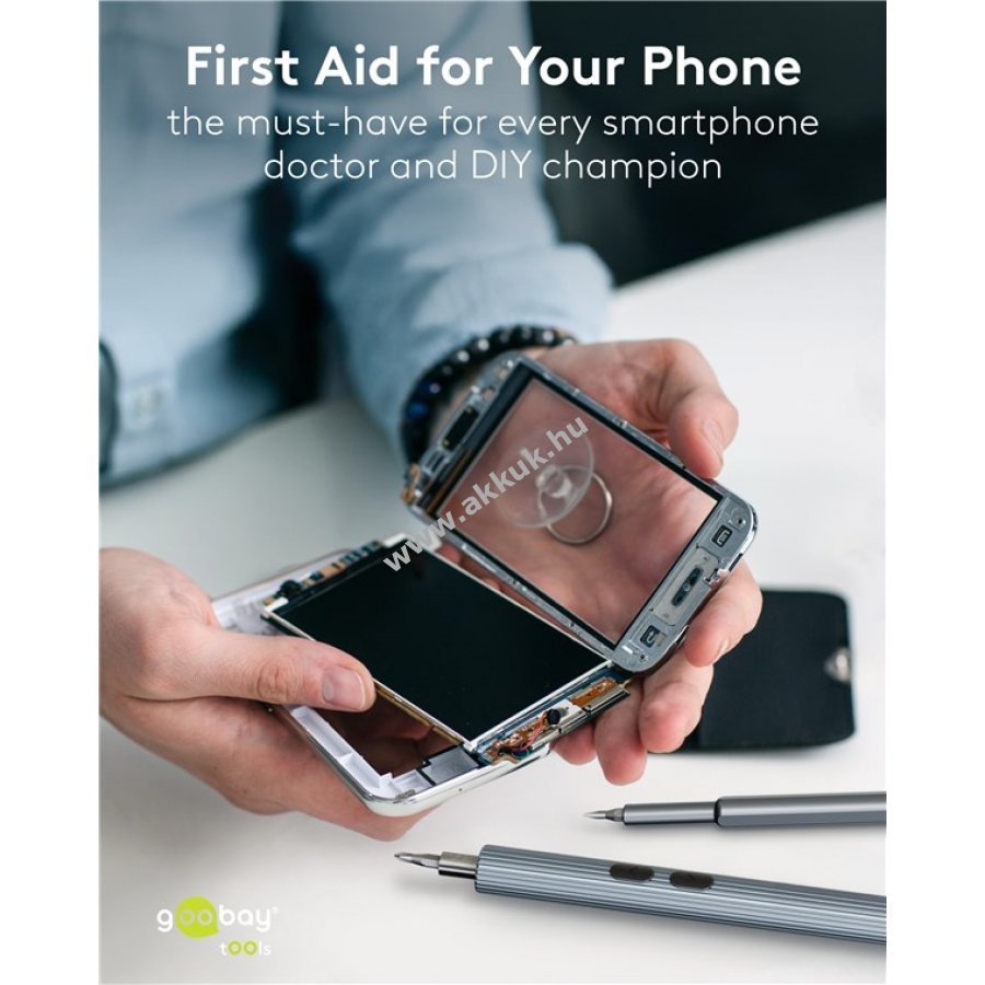 A készletben kézi csavarhúzó, tapadókorong, SIM-tű, nyitó eszköz és ESD 12 csúcsos csipesz is található finommechanikai munkákhoz.